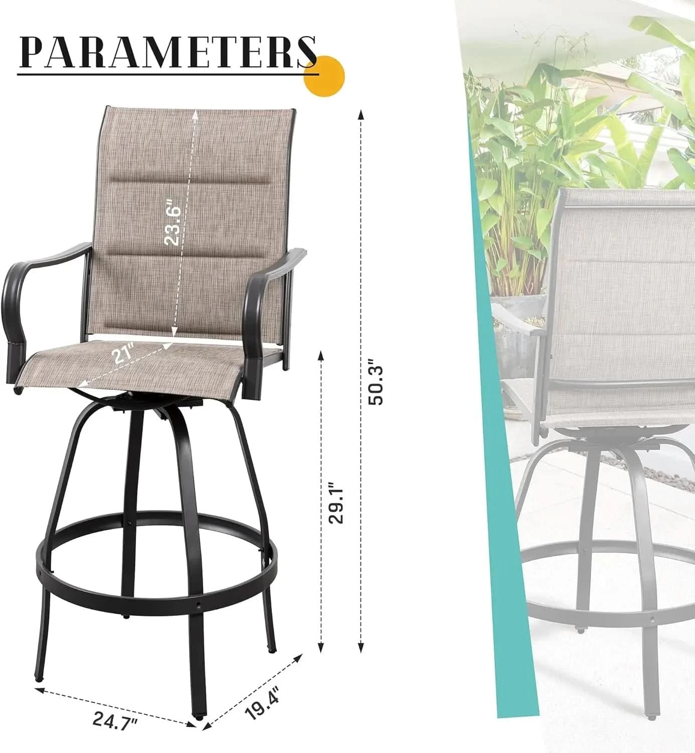 [Overall Dimension: Swivel Bar Chairs]: W 19.00" x L 29.72" x H 51.77", Seat Height: 29.1", 2 bar stools included, suitable for outdoor garden, lawn, terrace, pool, coffee time, as well as indoor kitchen, living room dinner time.