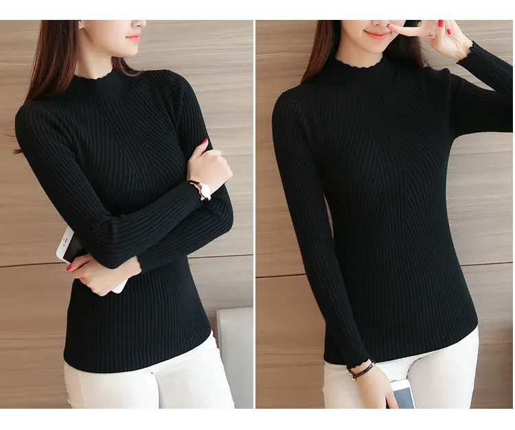 2025 Autumn Women Mock Neck Ruffles Sweater Long Sleeve Knitted Bottoming Solid Pullovers Stripe Women Casual Sweater Winter