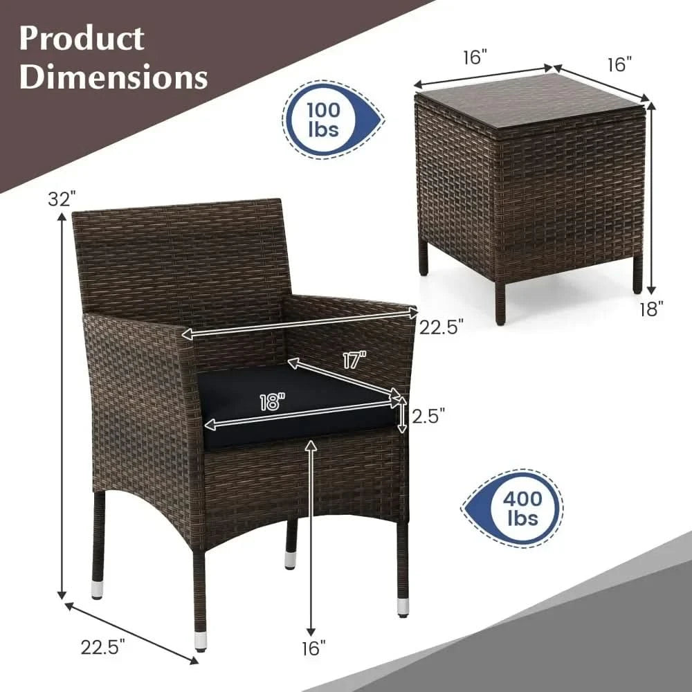 3 Piece Patio Furniture Set, Outdoor Wicker Patio Chairs with Soft Cushions & Tempered Glass Top Table, PE Rattan Bistro