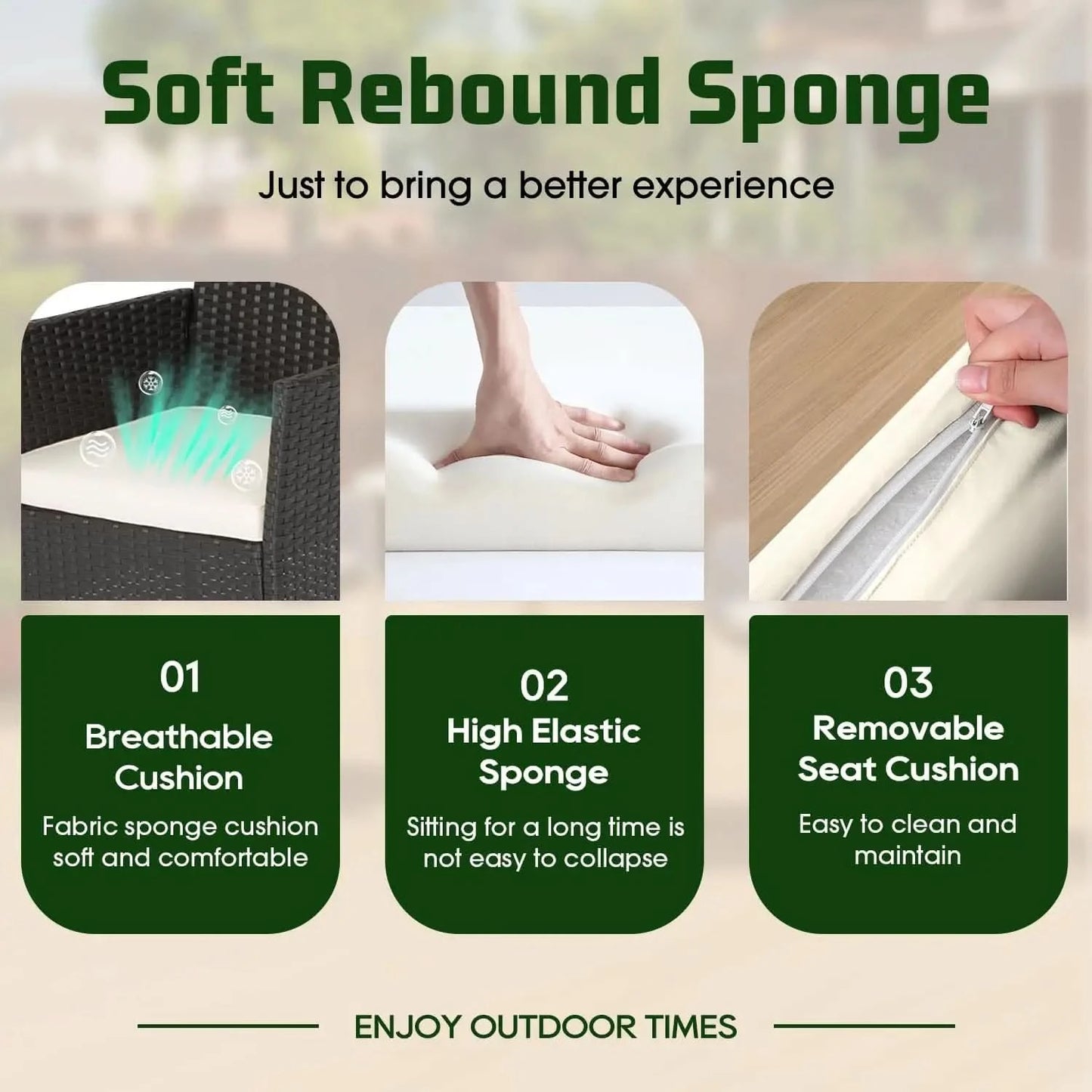 COMFORTABLE & STYLISH DESIGN: This patio set has thick, high-density rebound sponge cushions for cozy seating. Its simple, stylish look suits patios, balconies, poolside, or gardens.
