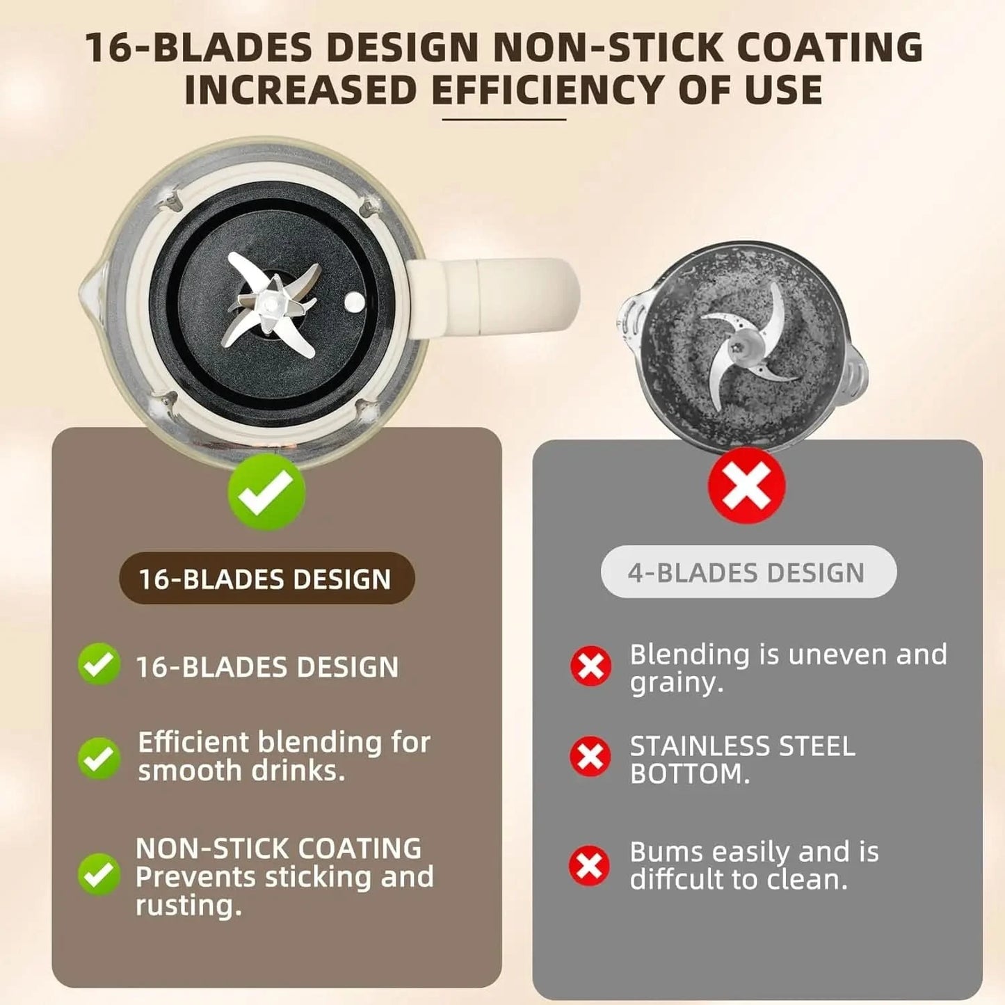 4. 【SILKY SMOOTHNESS 】: Traditional automatic nut milk maker produce plant-based milks that are coarse in texture and cumbersome to use, requiring repeated straining with a nut milk bag that can lead to poor taste. This multifunctional soy milk maker machine is designed with 16 blades, which greatly improves grinding efficiency and effectiveness, saves time soaking beans, and produces a silkier, smoother plant-based milk.