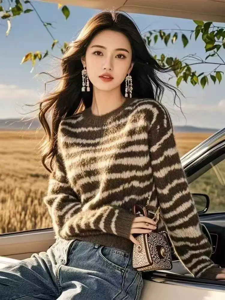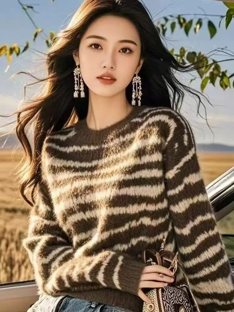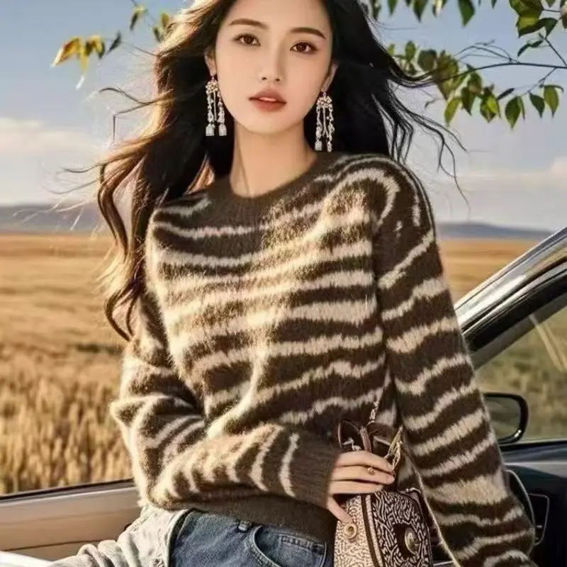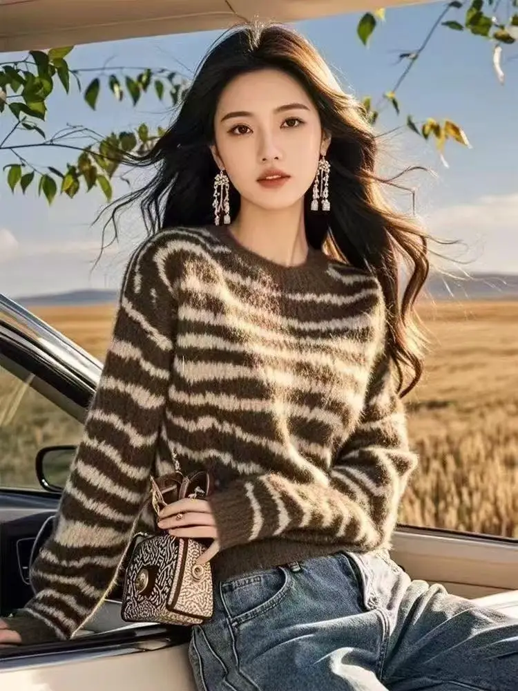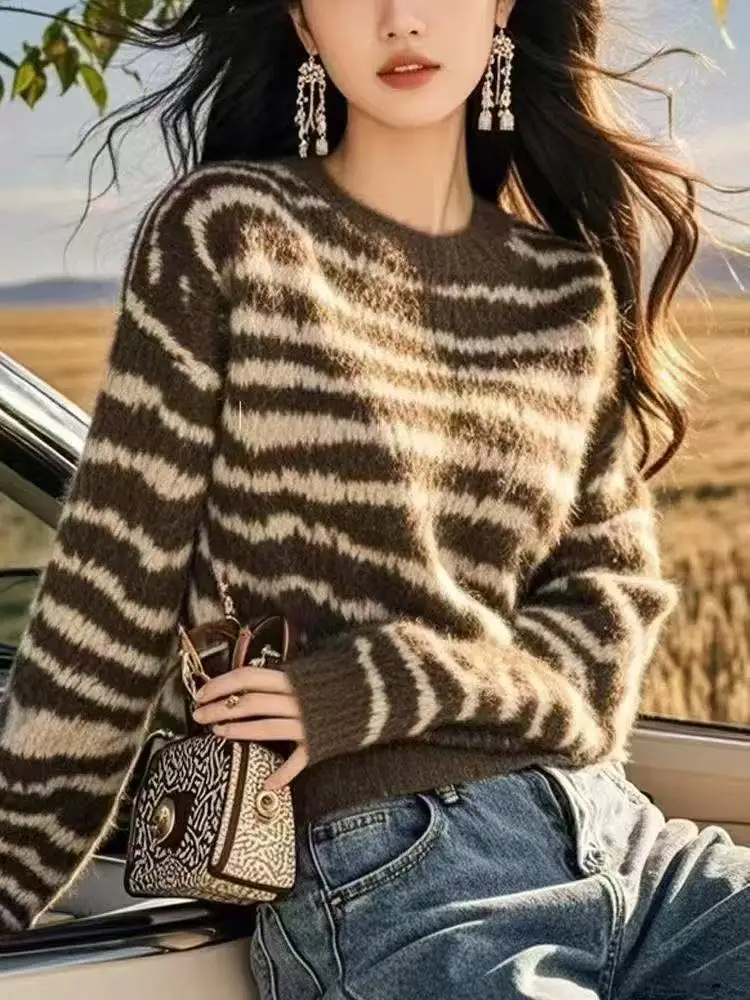 Autumn and Winter Pullover Round Neck Long-sleeved Striped Sweater for Women Retro Versatile Fashionable Casual Top