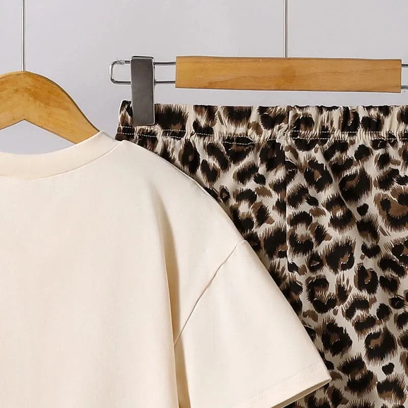 Children Clothing Sets Beige Bow Printed T-shirt & Striped Leopard Pants Trendy Girls Outfit Summer Clothing Sets 8-12 Kids Suit