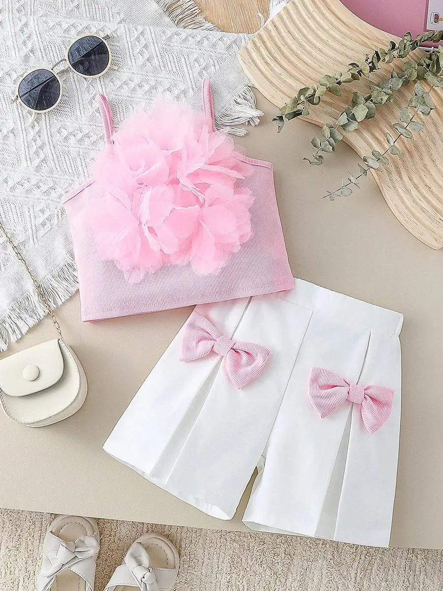 Children Clothing Summer Girl's Pink Outfit Sets Lace Mesh Flower Vest & shorts Pants Kids Clothes Girl's Elegant Sets For 1-6Y