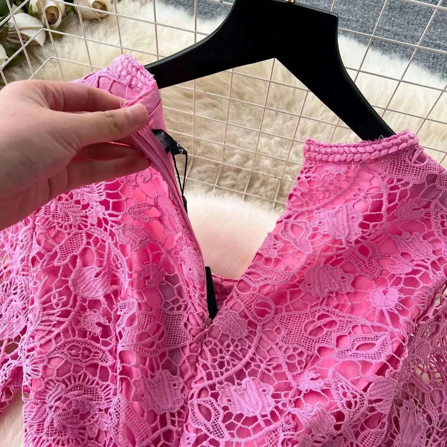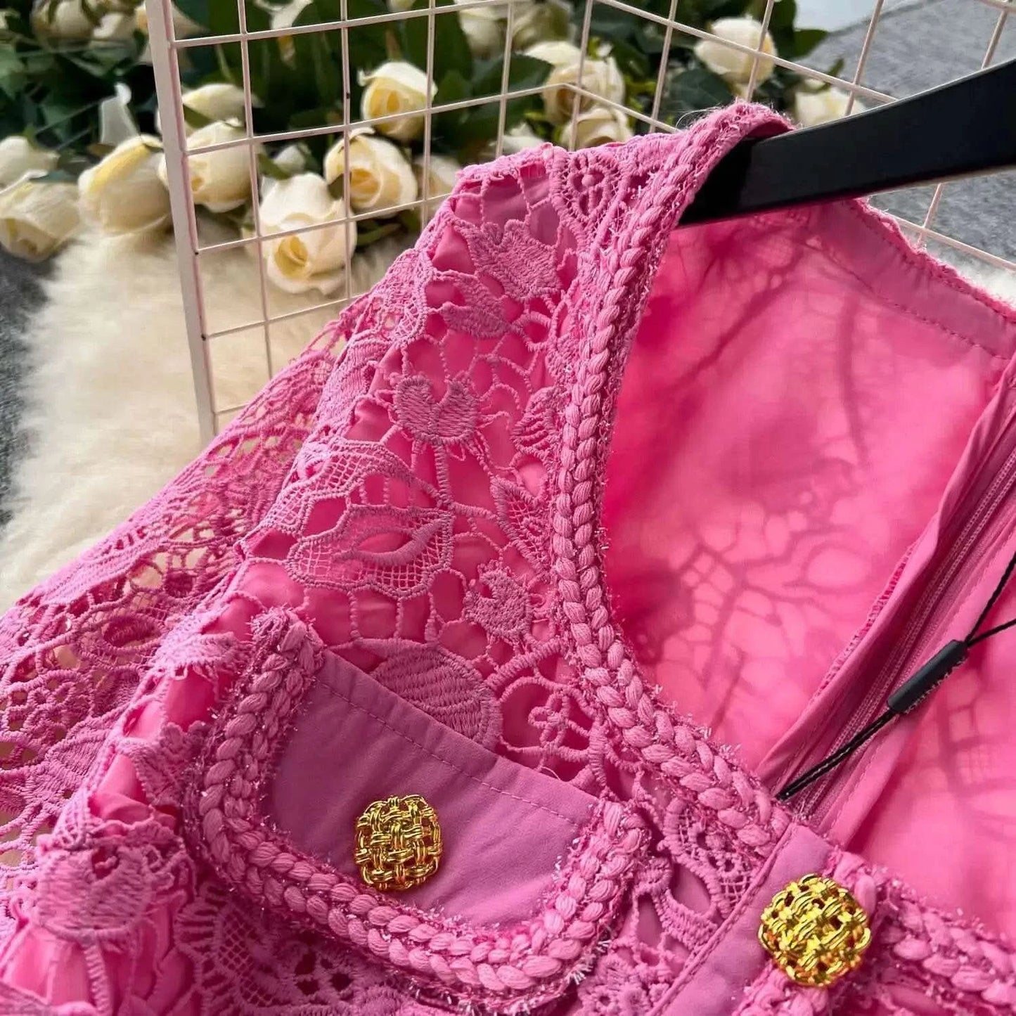 Designer 2025 Summer Pleated Chiffon Lace Long Dress Women Flower Embroidery Gold Button Belt Evening Party Dresses Wedding Robe