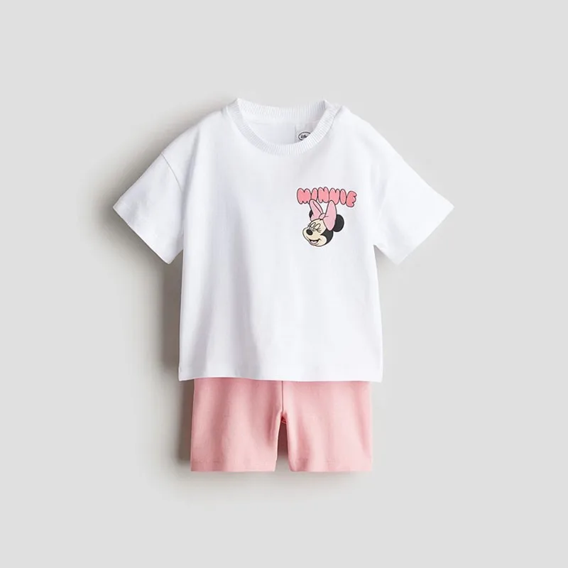 Disney Cartoon Girl Clothing Short Sleeve Suit Lovely Fashion Children's Loose Tees Tight Shorts Summer Kids Two Piece Set 9M-7Y