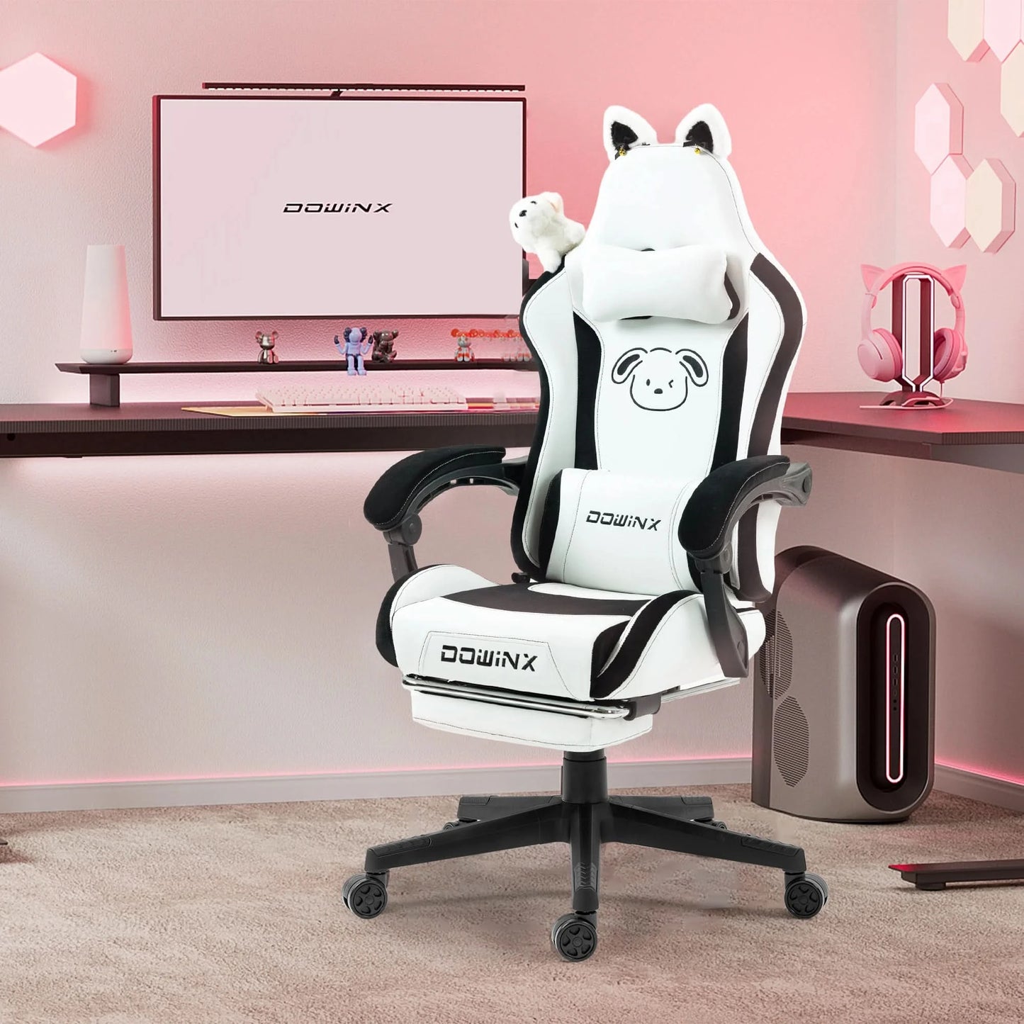 Dowinx Gaming Chair Cute with Cat Ears and Massage Lumbar Support, Ergonomic Computer Chair for Girl with Footrest and Headrest