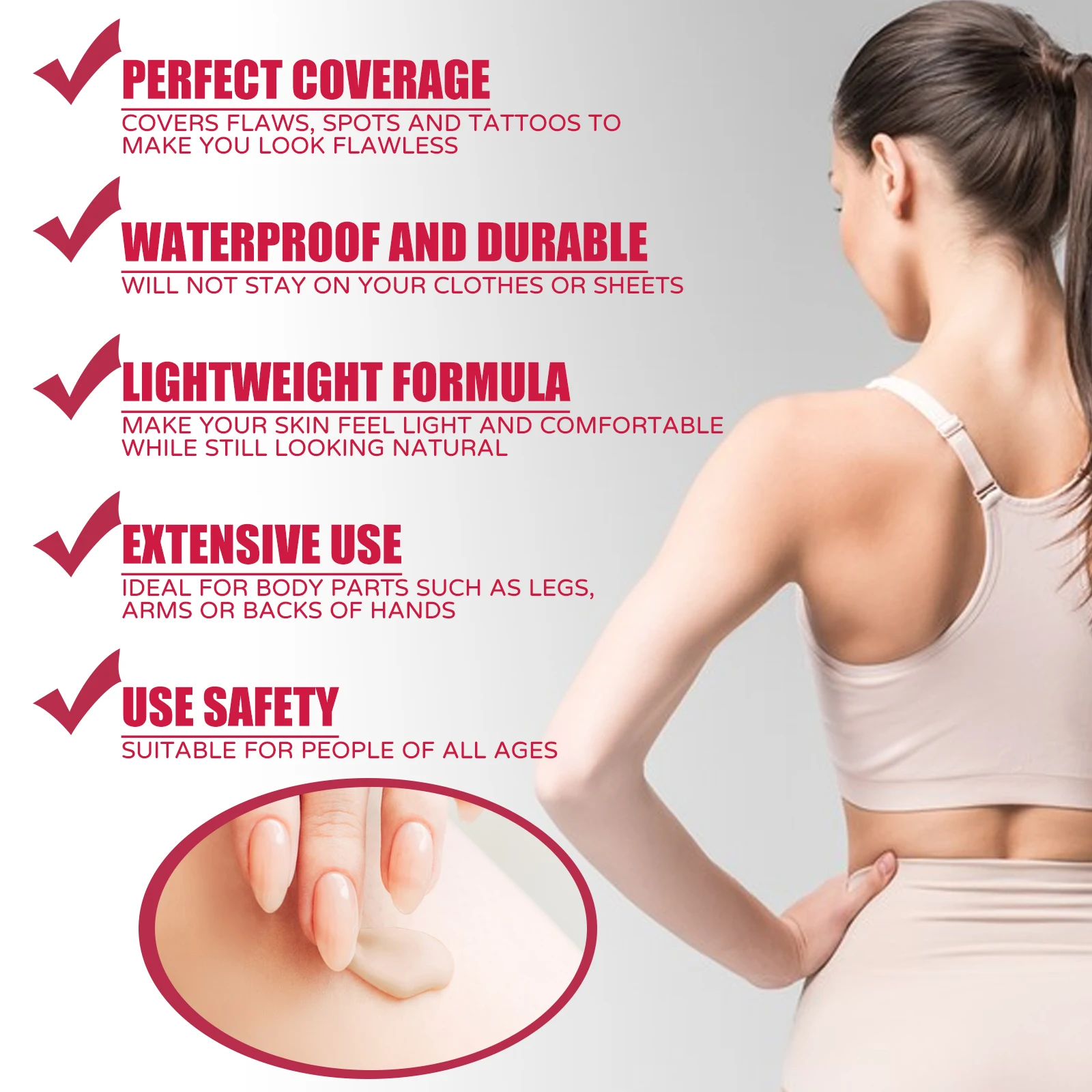 Effectively hides stretch marks, varicose veins, tattoos, scars, and blemishes for a flawless appearance.