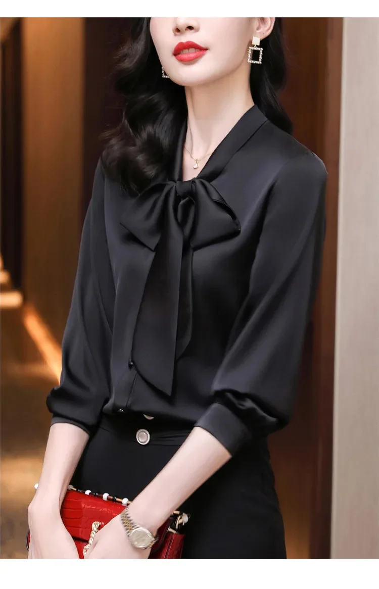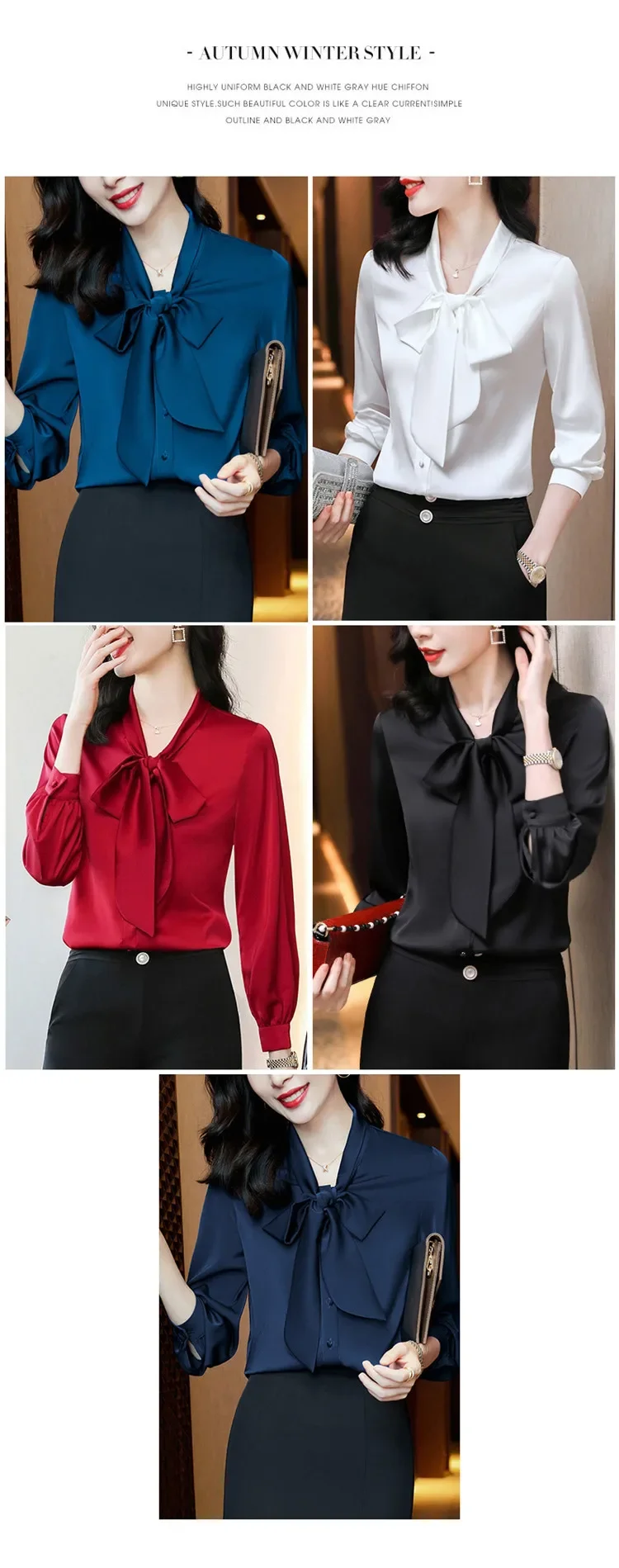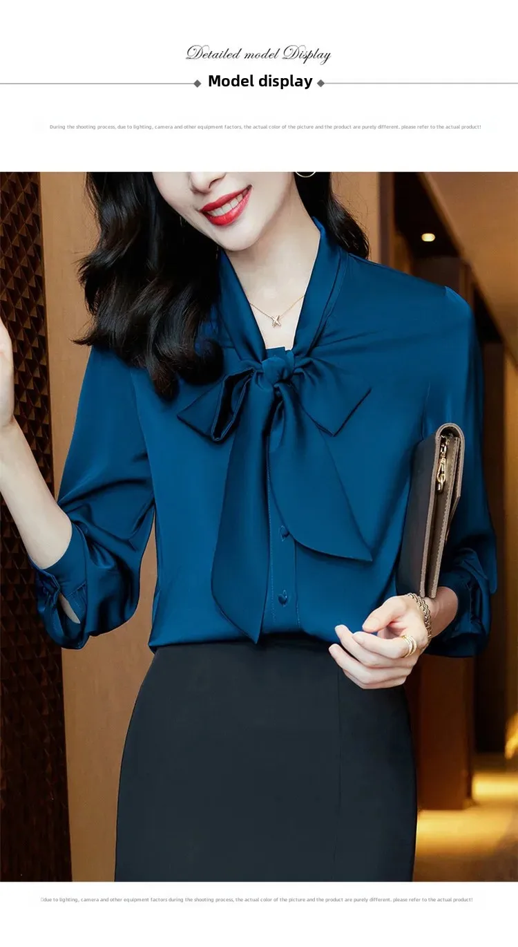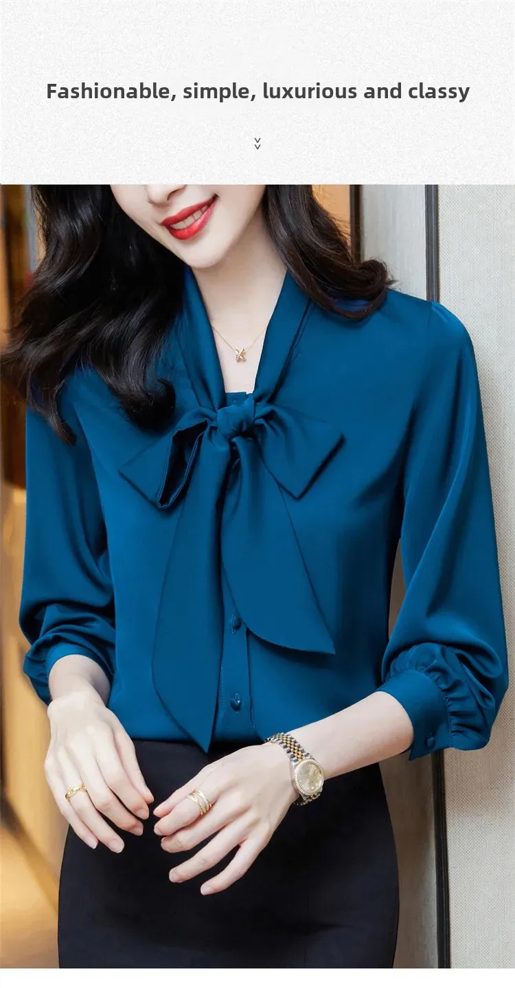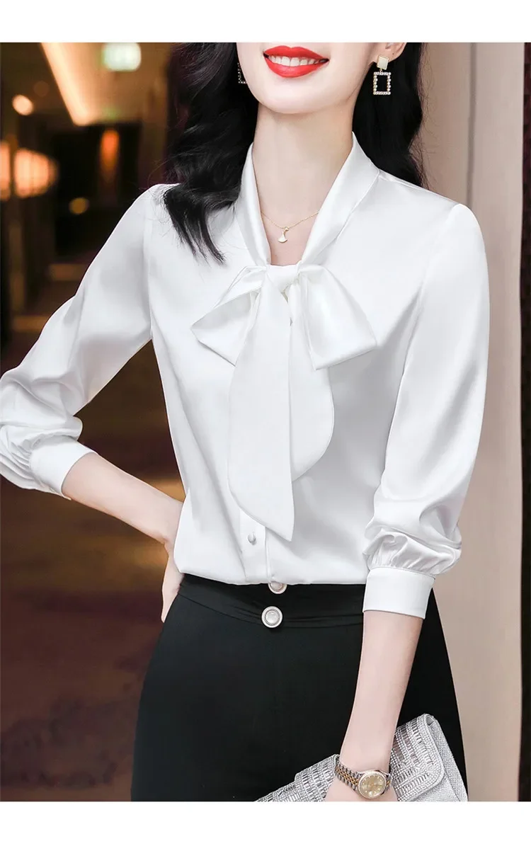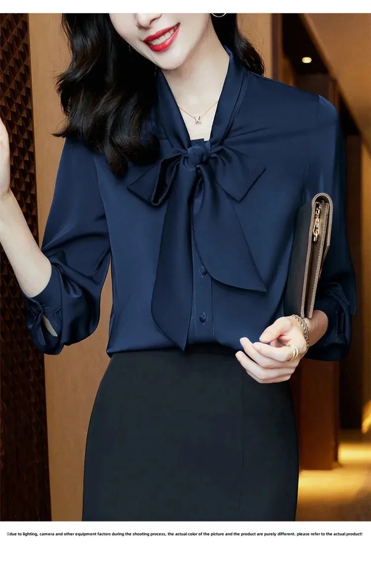 Elegant Pure Color Long Sleeve Women's Shirt with Bow Tie Single Button Open Cardigan Spring Autumn Fashionable Ageless