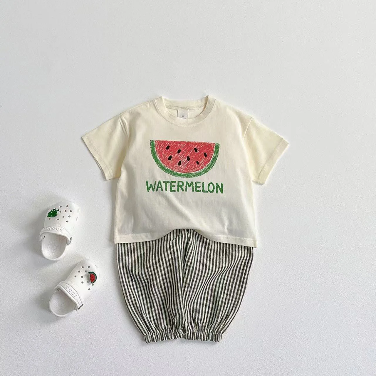 Fruit Tshirt Plaid Shorts 2Piece Set Boys And Girls Cute Tees Loose Shorts Kids New Simple Round Neck Tops+Shorts Kids Suit