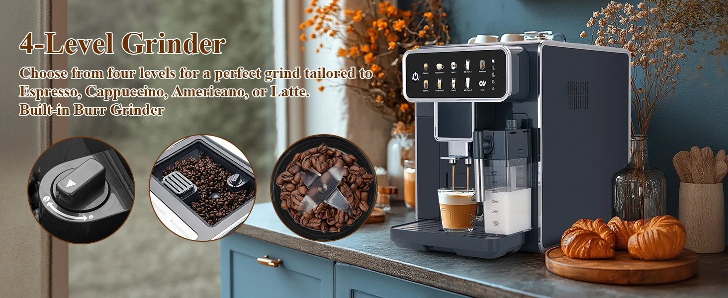 2. Fully Automatic Brewing: Enjoying a variety of coffee drinks withjust one-touch,this espresso machine is perfect for any coffee lover.With a built-in grinder offering 3 grind levels,you can customize your coffee experience for a fresh, aromatic brew every time.
