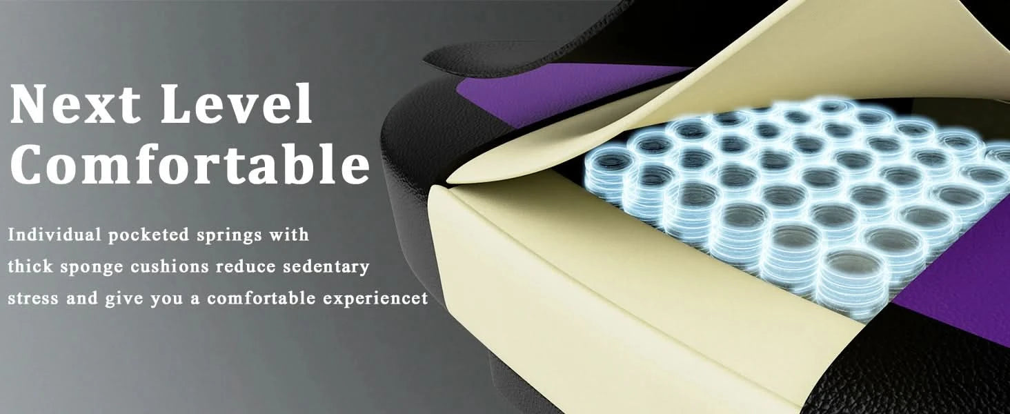 Premium Pocketed Springs For Sofa-Like Comfort: Our gamer chair features the same individual pocketed springs as a luxury sofa, with high-density resilient foam that won't sag even after extended use. The wingless seat design eliminates pressure on your thighs, while the breathable, skin-friendly PU leather keeps you warm in winter and cool in summer. Say goodbye to numb legs and sweaty backs! No more squirming in your seat!