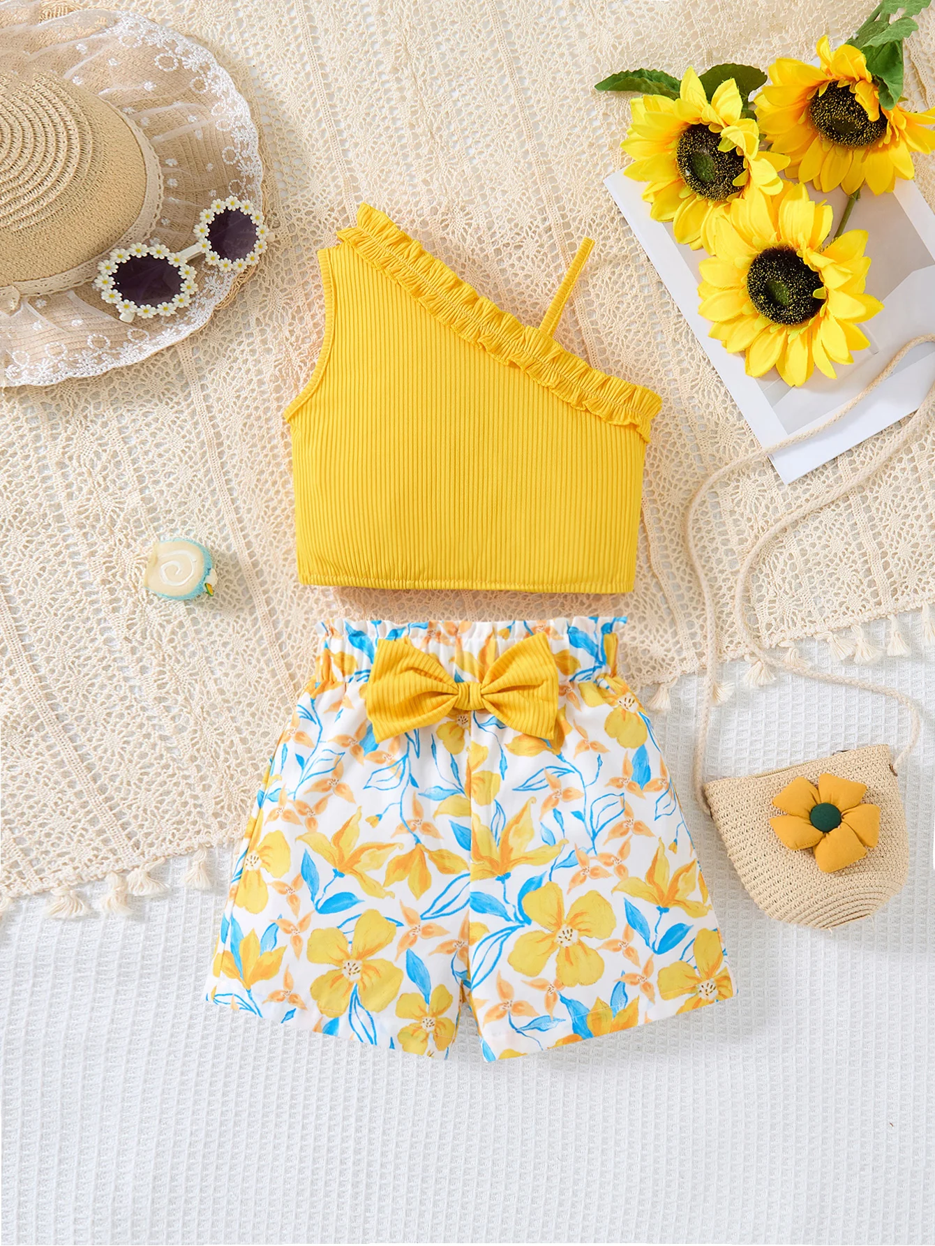 Girls Children Fashion Suit One Shoulder Top & Shorts Printed Floral Girl Summer Suspender Set Birthday Gift Fashion Suits