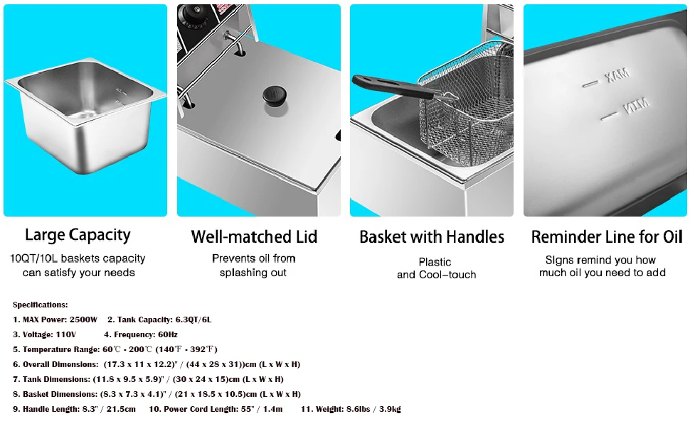 1. Heavy Duty Deep Fryer, 6.3QT/6L Stainless Steel Large Single-Cylinder Electric Fryers with Removable Basket and Professional Heating Element, 100V/2500W Max US Plug