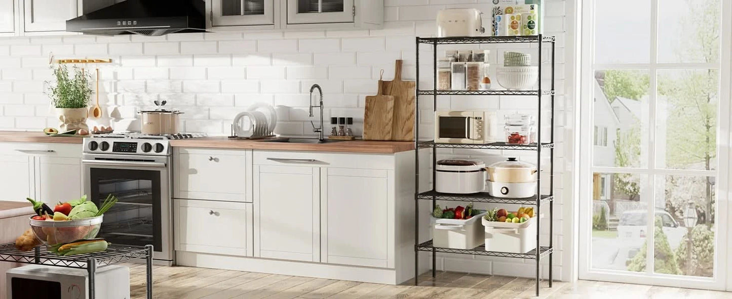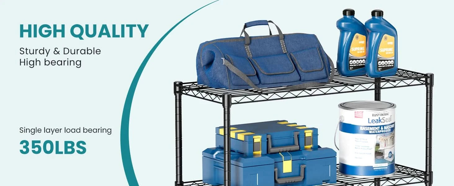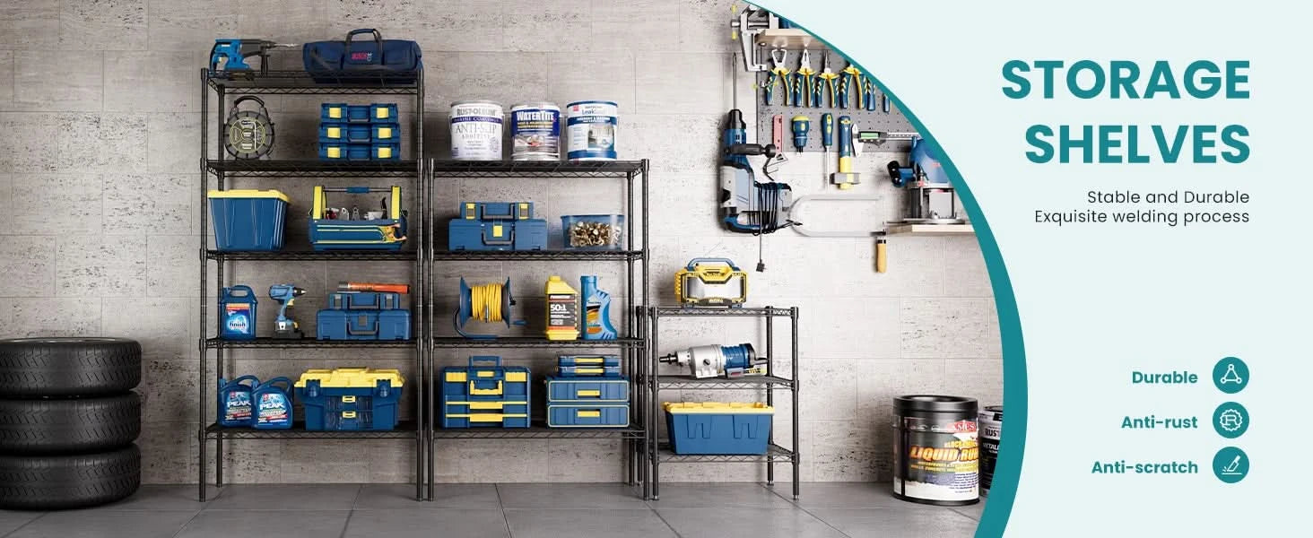 【Adequate Storage Space】The 3-5 Tier metal storage shelves combine practical design with a stable structure, providing ample space to organize your items and convenient placement and retrieval of tools and items