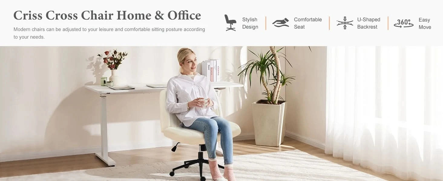 【Comfortable Sitting Sensation】Cushion filled with high-density sponge along with padded backrest, this criss cross desk chair is made for sedentary users, offering a cozy sitting experience even after long-time sitting. Great for work, study, makeup, sewing, etc. Its contemporary design also blends perfectly with most spaces, adding a touch of style to any room.