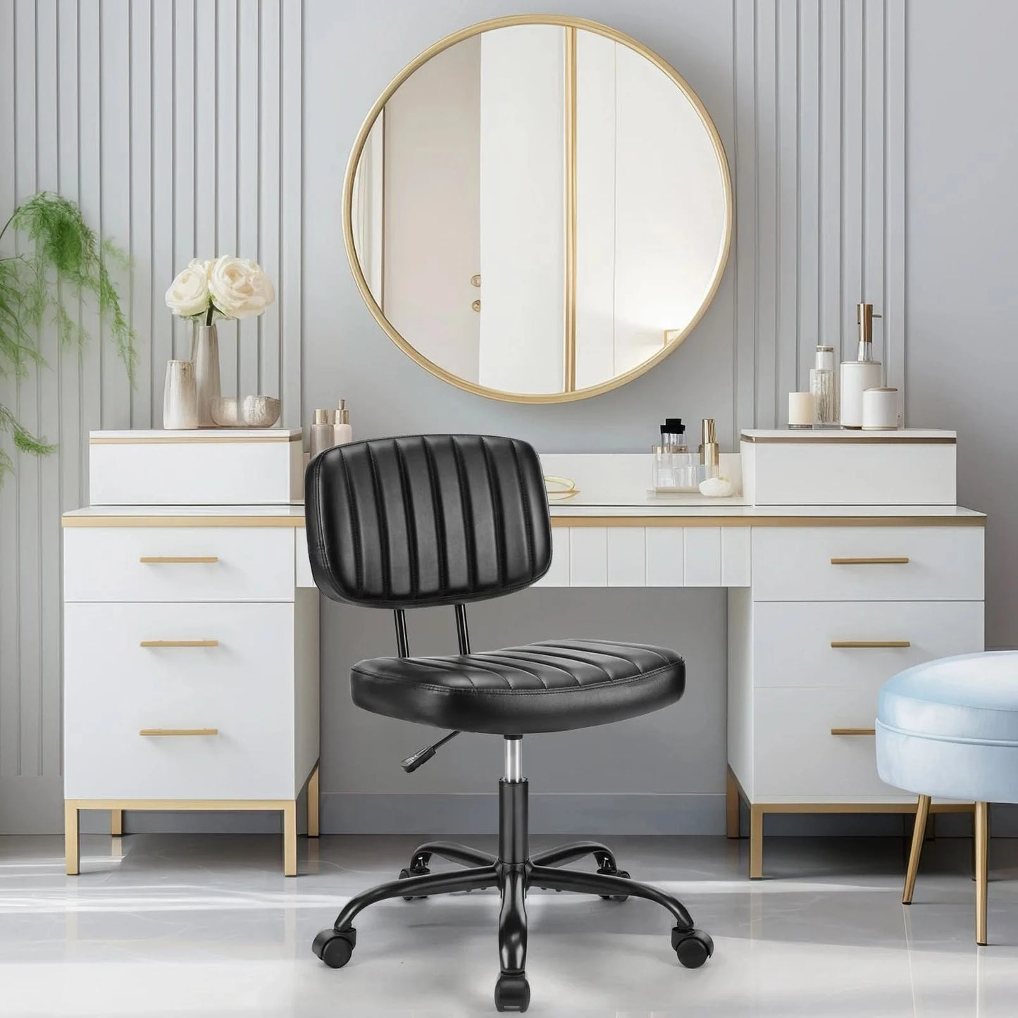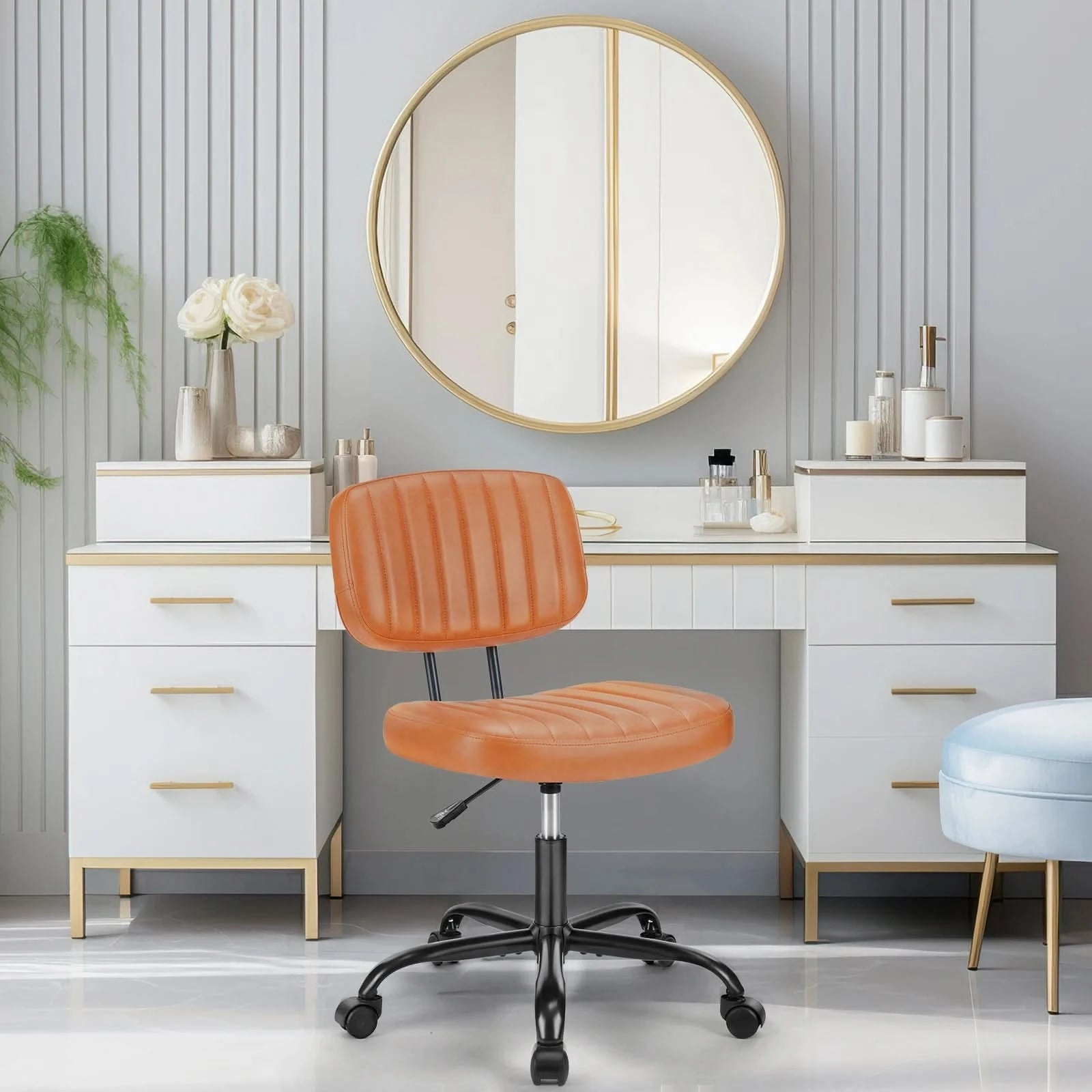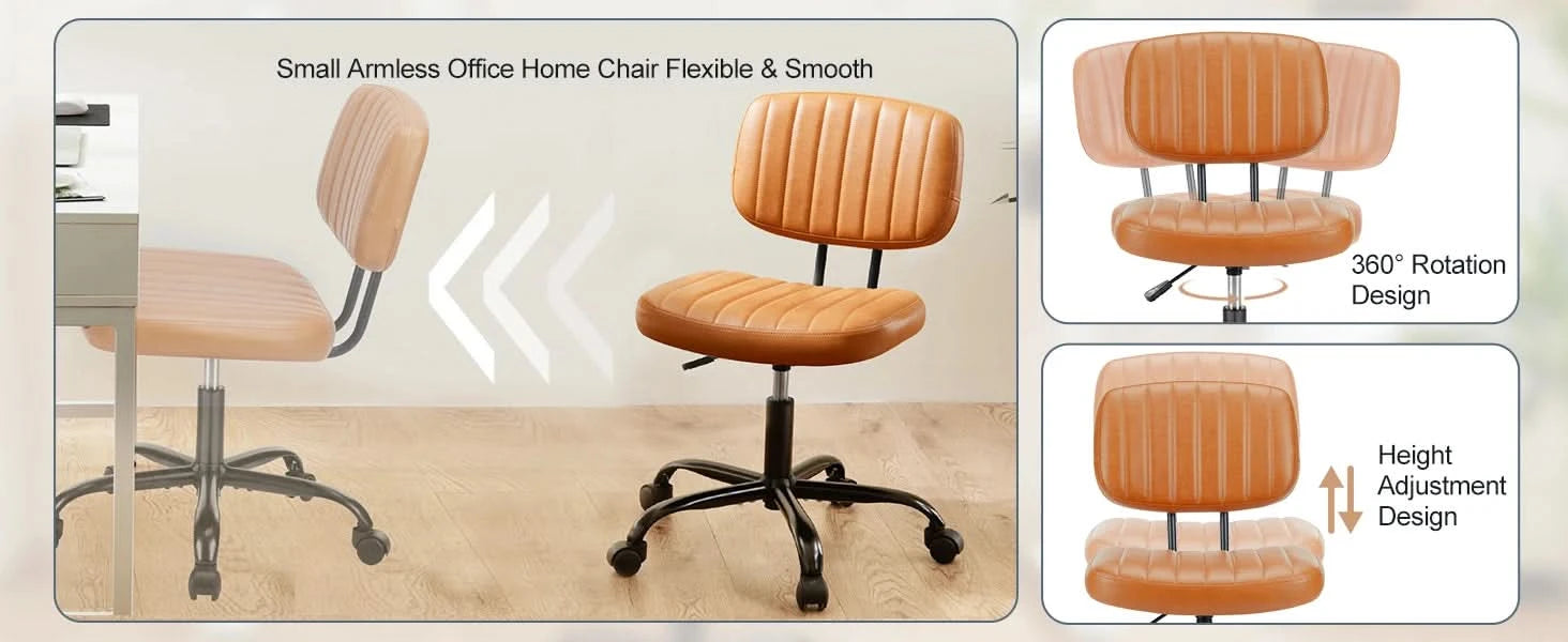PREMIUM MATERIALS - This small office chair without an armrest is constructed with top-notch materials to guarantee maximum comfort and longevity. It features a high-density, thickened sponge cushion (2.5 inches), that provides exceptional comfort and resilience. The chair is upholstered with high-quality PU leather, ensuring both waterproof protection and breathability through its twill design.