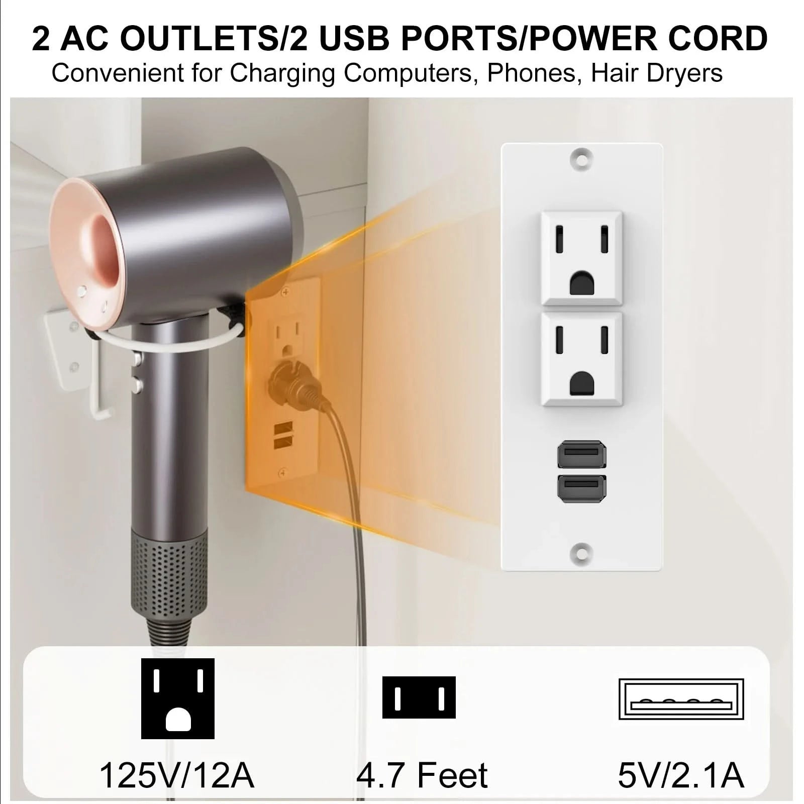 Built-in Charging Station with Power & USB Outlets - Stay connected and powered up with 2 standard AC outlets (125V, 12A) and 2 USB ports (5V, 2.1A). Charge your phone, hair tools, or beauty gadgets right from your vanity — no more searching for wall sockets.