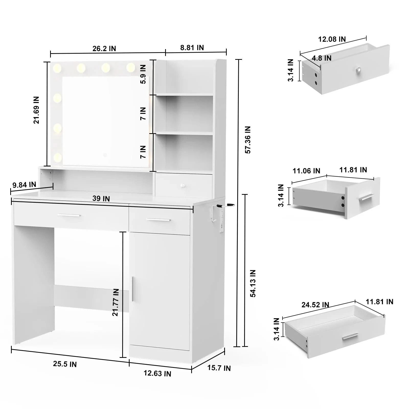 All-in-One Vanity with Smart Storage - Designed for ultimate organization, this makeup vanity includes 1 large lighted mirror, 3 slide-out drawers, 4 open shelves, 1 tabletop, a hair dryer holder, and 2 spacious cabinets with adjustable shelf. Keep all your beauty tools neatly stored and within reach.