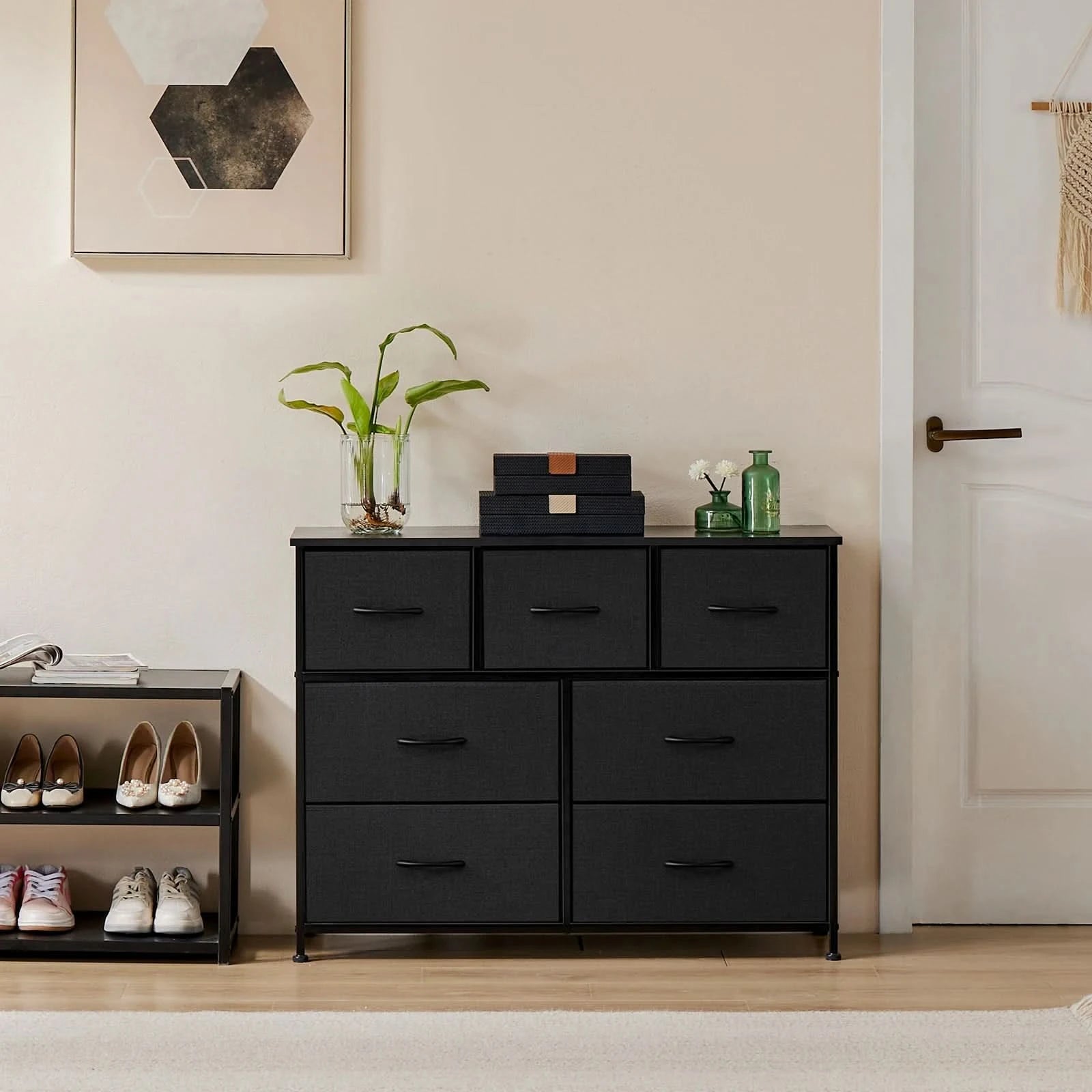 【Large Capacity】This dresser offers 7 drawers providing sufficient space for organizing daily necessities. 4 L and 3 M drawers are designed to satisfy your various storage needs. The wooden top of the bedroom dresser is great for keeping the most-used items within your reach. With plentiful space to organize, your room will always be kept in perfect order. Drawer dimensions: L(11.8" L x 11.8"W x 8.5" H) ;M(12"L x 11.4"W x 8.3" H)