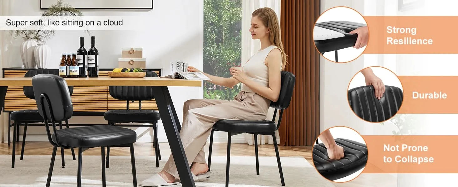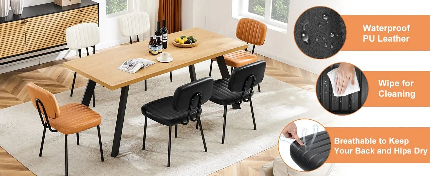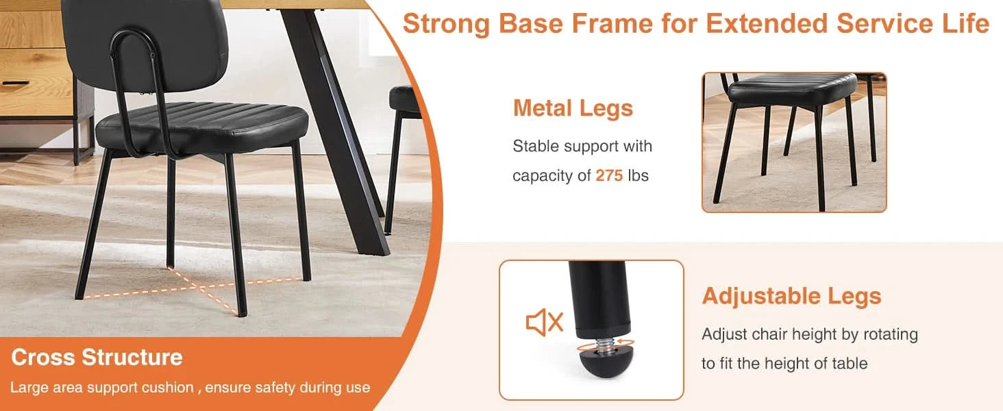 ćComfortable experiencećThe mid-century modern dining chairs are designed according to ergonomics, with a mid backrest providing strong support for your back. The seat cushion is made of artificial leather and filled with high-density sponge, which increases comfort and durability, allowing you to sit for long periods without pressure