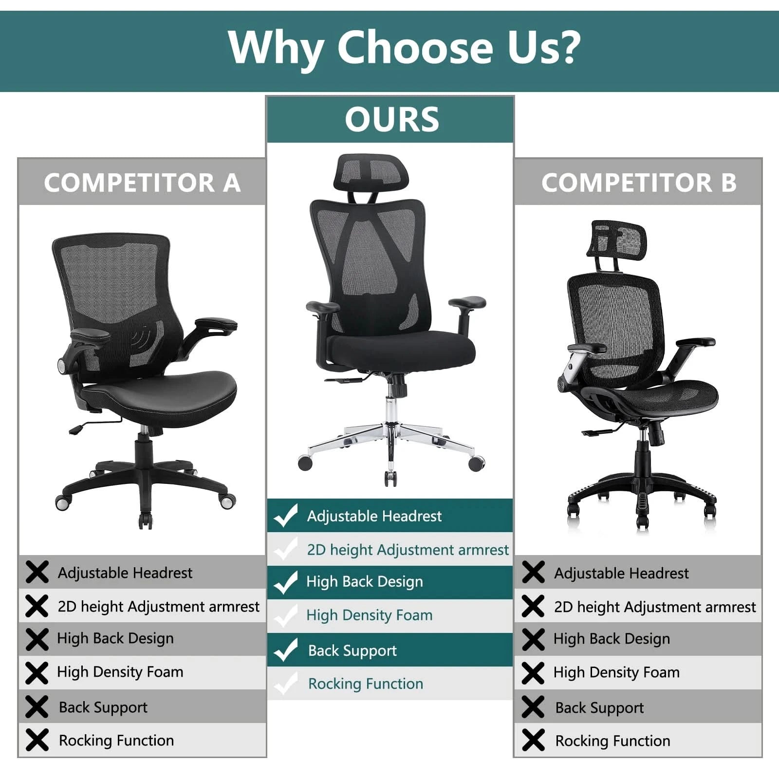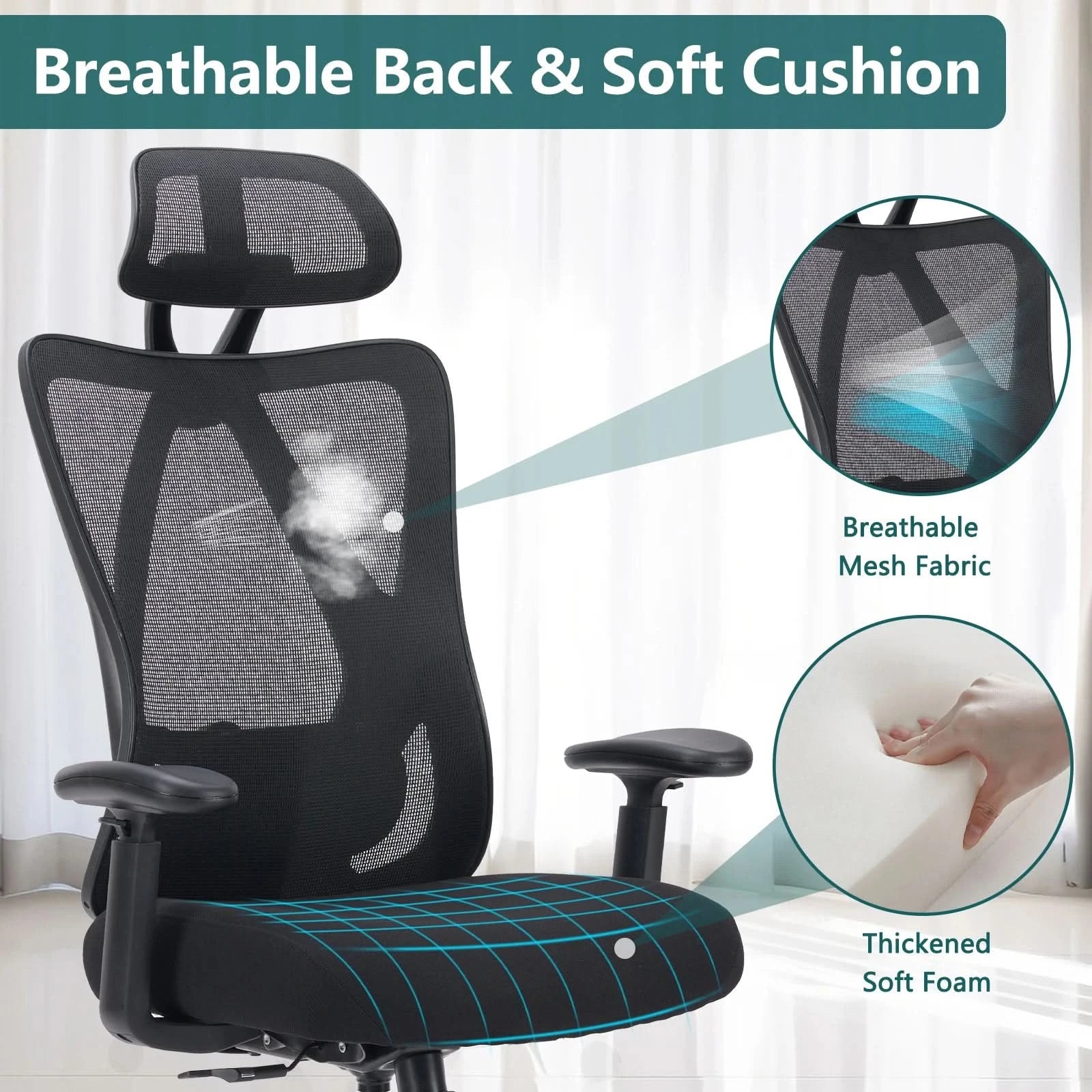 【Customizable 2D Arms】The high back ergonomic office chair features 2D arms that can be easily adjusted to your preferred height and angle. This allows you to find the perfect position for your arms and shoulders, relieving strain and promoting proper posture
