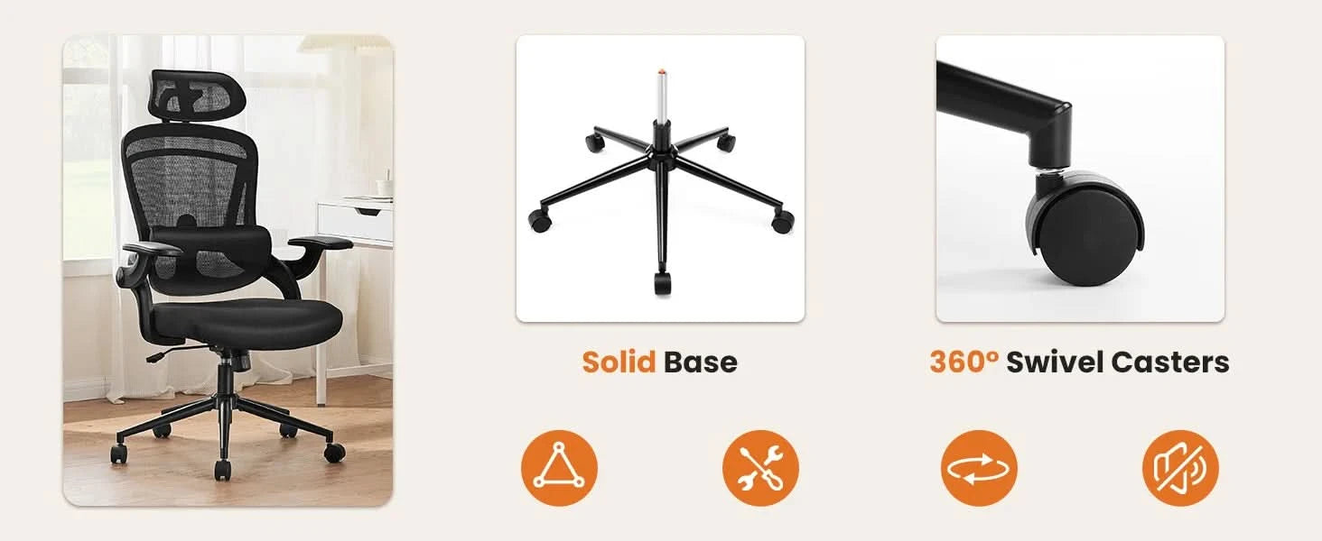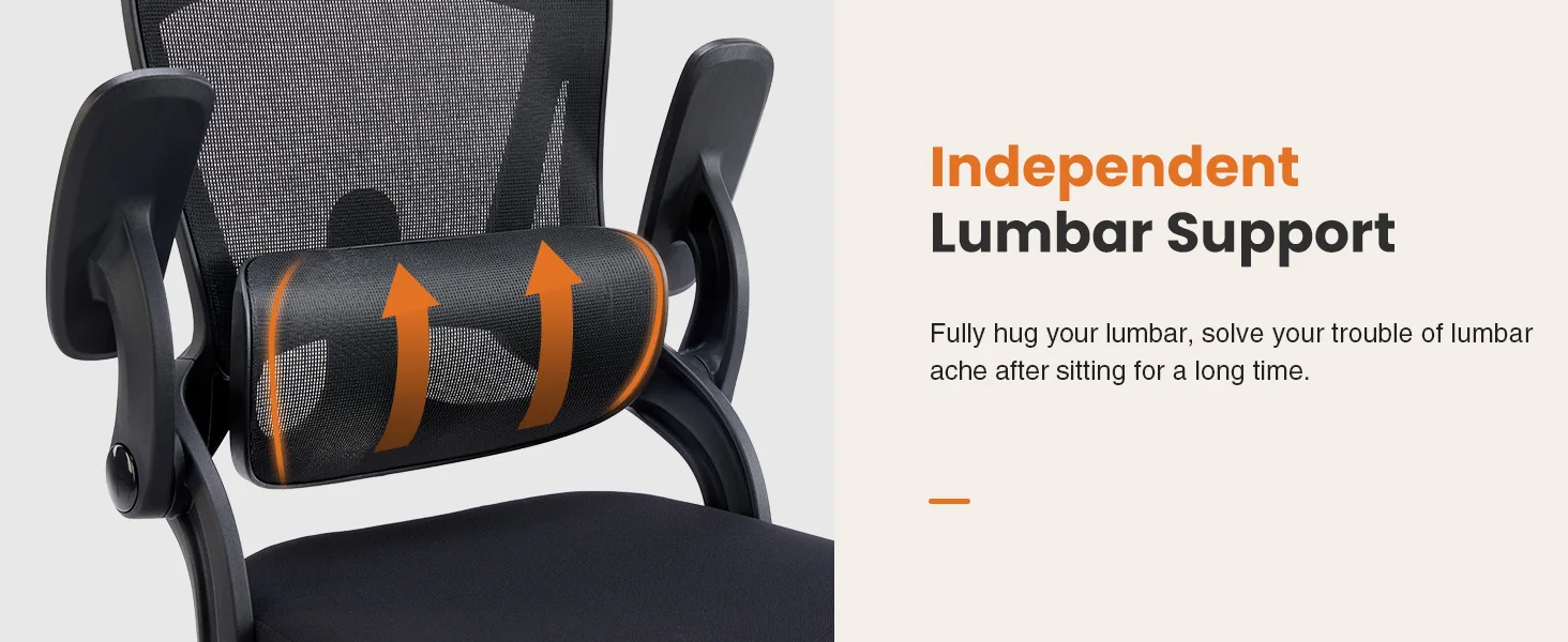 【Adjustable Lumbar Support&Headrest】The headrest of this ergonomic home office chair is adjustable in height and 42° angle to meet the needs of work and relaxation. The mesh lumbar support can be adjusted up and down, front and back freely to fit the lumbar area more closely and relieve the fatigue of sitting for a long time.