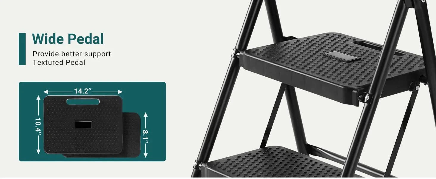 [Widen Pedals]Step stools for adults features wide pedals with an anti-slip particle surface, providing full support and stability for your feet. The textured design ensures firm footing, reducing the risk of slips and falls for safer climbing.
