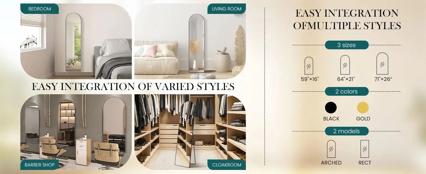 ALL-MATCH: No Assembly Required. The floor length mirror can stand anywhere with the standing holder. You also can lean it against a wall, or you can hang it horizontally or vertically on the wall for space-saving. It is suitable for a bedroom, living room, cloakroom, home gym, corridor, clothing shop, etc.