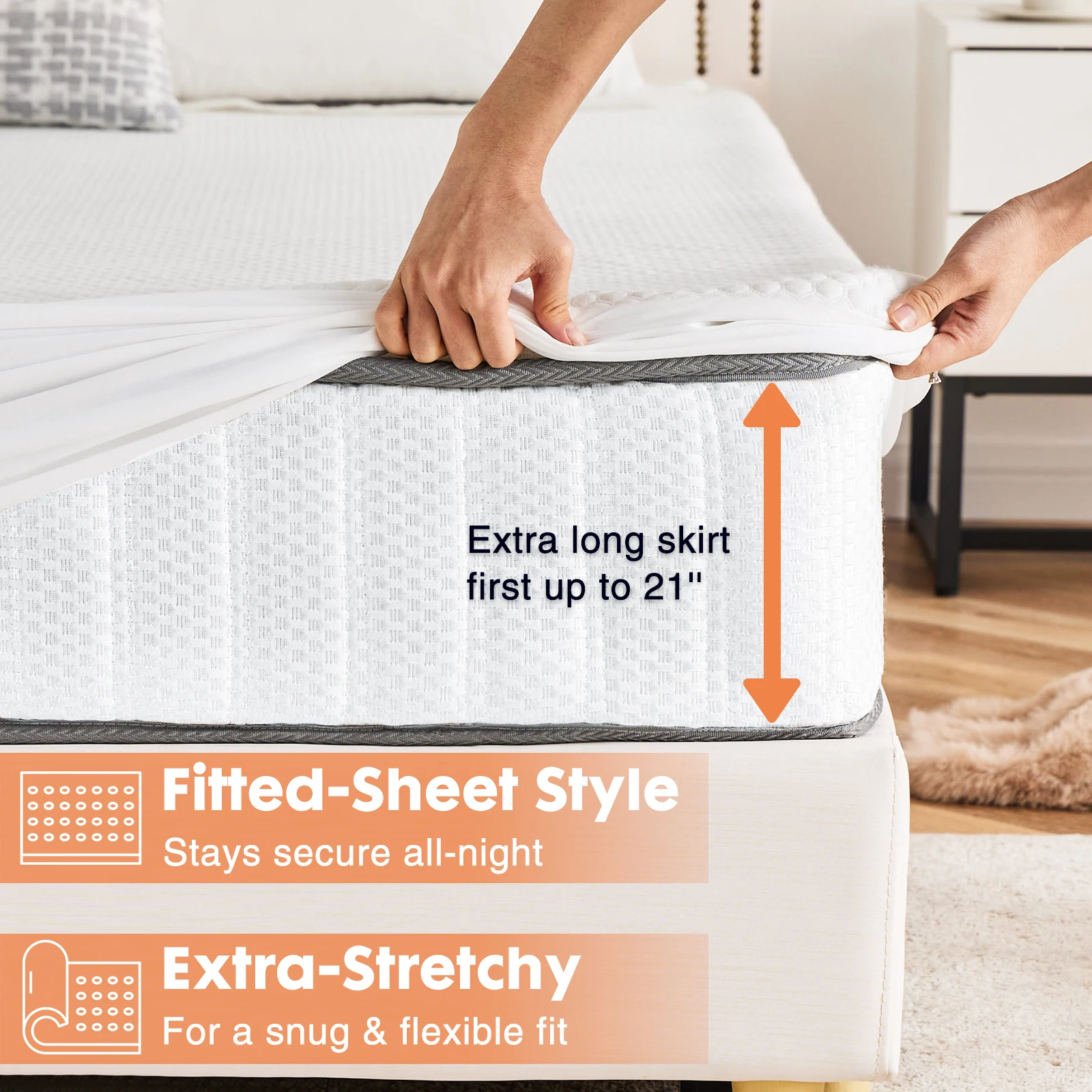 360Β° WRAP-AROUND MATTRESS PAD COVER: Multiple sizes to choose from (Twin, Full, King, Queen). Sturdy elastic skirt designed to encase the mattress in all directions and stays flat and won't shift. This waterproof mattress protector is flexible and adaptable to different thicknesses of mattresses, accommodating a range of 8"- 21".