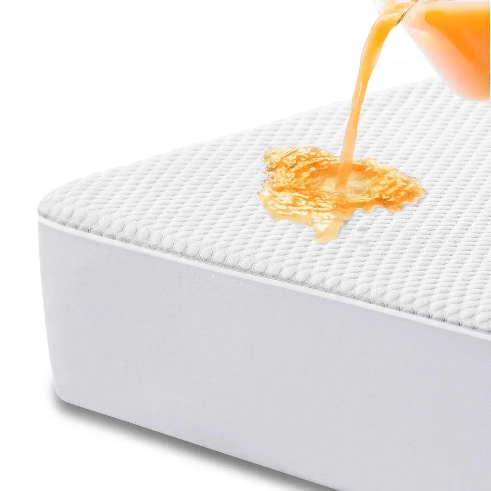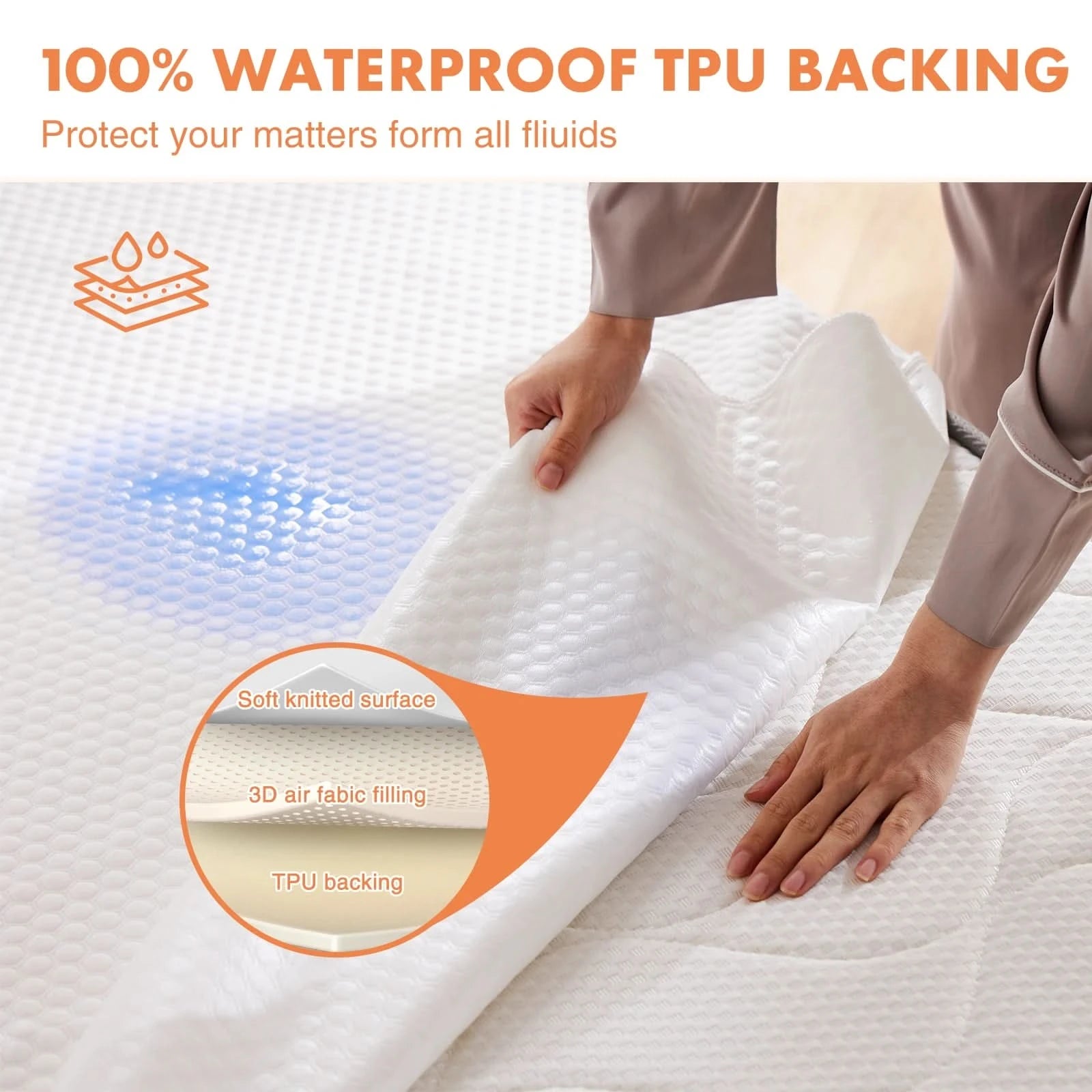 100% WATERPROOF DESIGN: The lining of this mattress pad protector is made of premium waterproof material (TPU), which prevents liquids like water, drinks, tears, urine and other liquids from leaking, effectively protecting the mattress. This cover mattress is perfect for new moms, kids, pets and the elder!