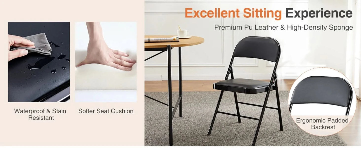 【Superior Comfort】The folding chair's backrest and seat cushion feature high-density sponge padding, providing exceptional comfort for you or your guests. The premium quality PU leather used gives an excellent touch and provides an impressive sitting experience, making this chair soft and comfortable yet durable and easy to maintain.