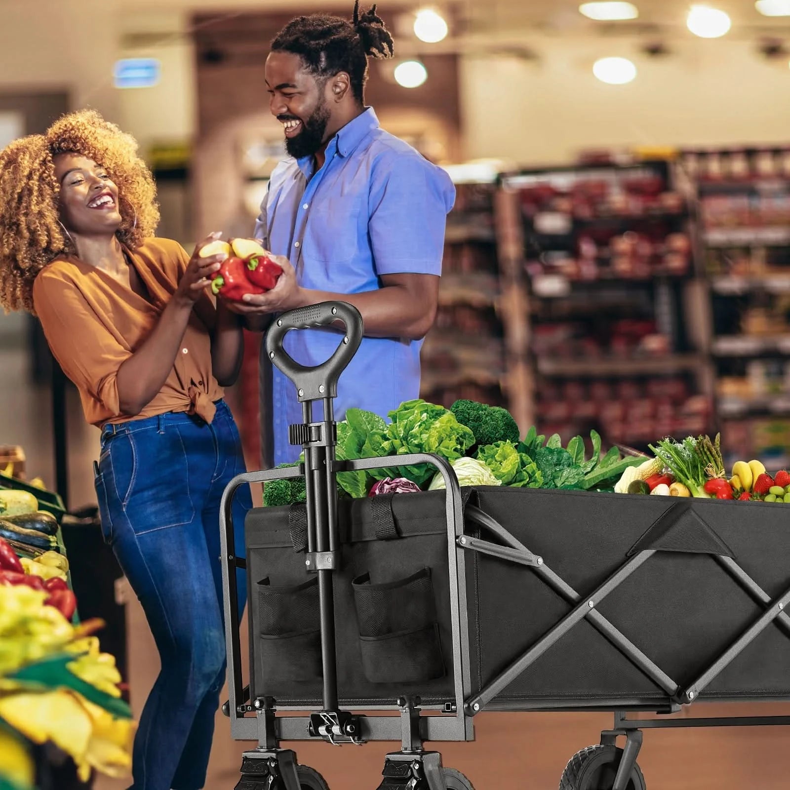 γLarge Capacity Collapsible Wagon CartγWith dimensions of 29.5'' x 18.5'' x 35'', Sweetcrispy Folding Wagons Carts have plenty of room to store all your essentials for your outdoor adventures. It can effortlessly carry up to 220lbs of gear, making it ideal for hauling camping equipment, gardening supplies, groceries, and more.