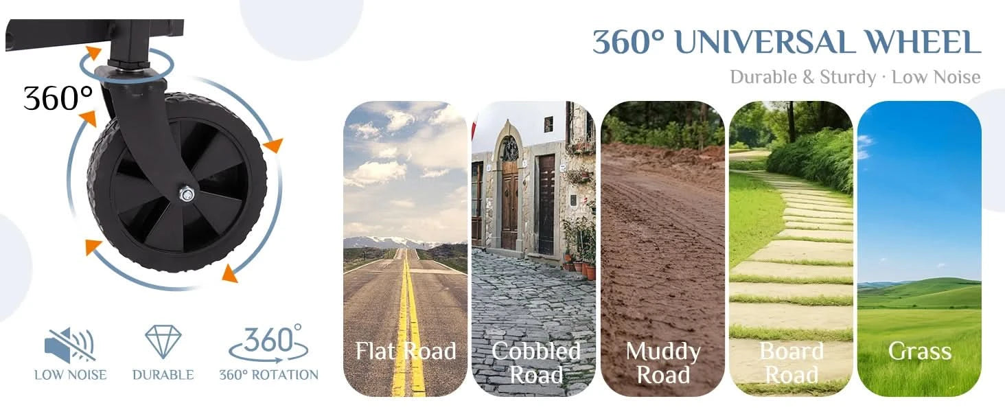 γAll-Terrain WheelsγTake on any surface with confidence using the utility wagon's rugged all-terrain wheels. Designed with non-slip surface and 360-degree rotation, these wheels ensure smooth and hassle-free movement even on rough roads.