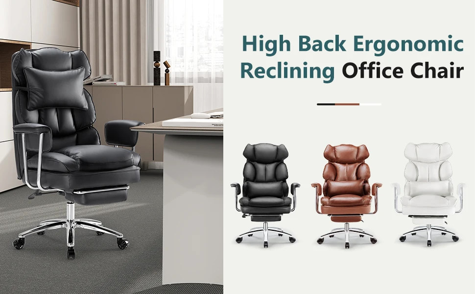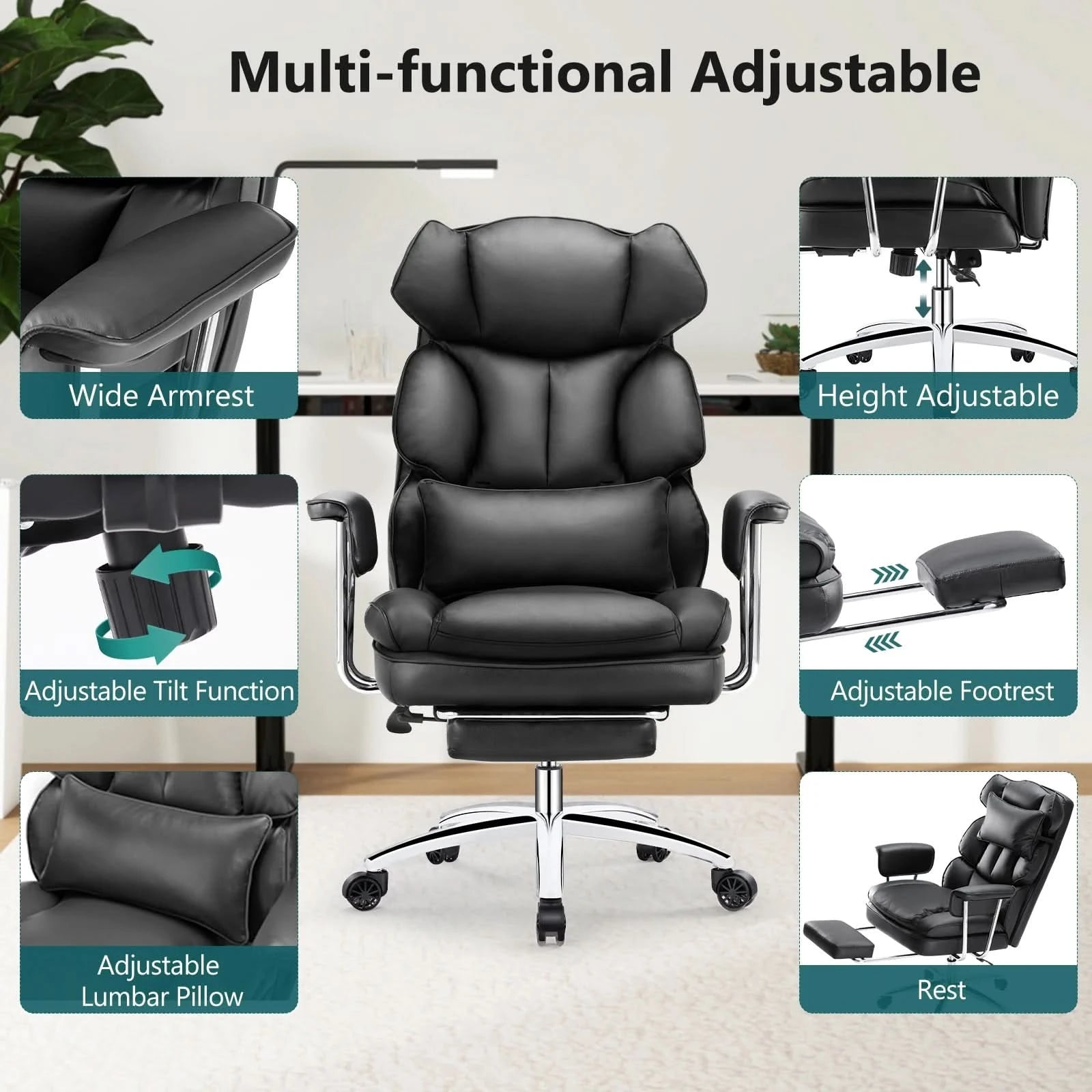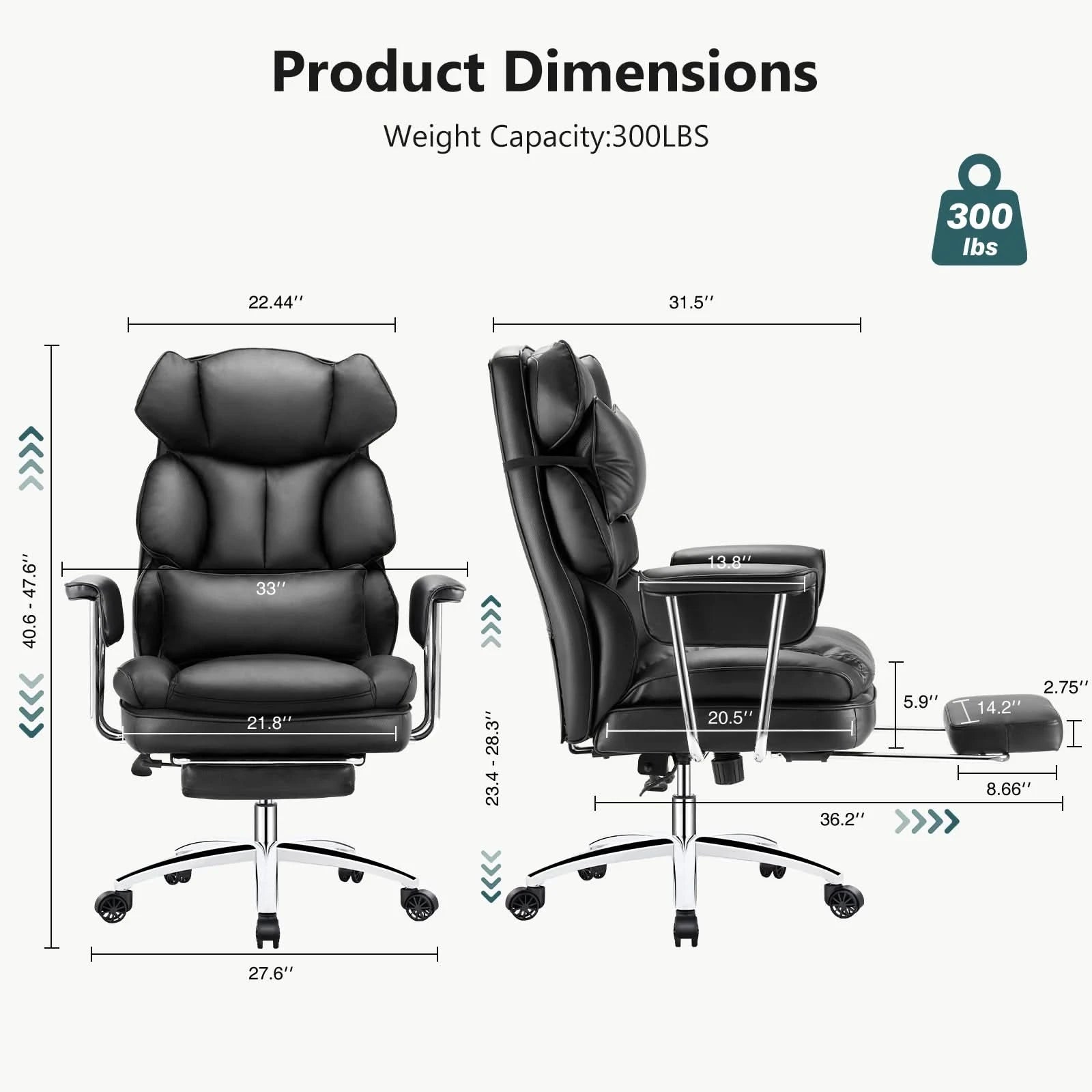 【DYNAMIC MULTI-FUNCTIONAL ADJUSTMENT】The desk chair has 360° free and smooth rotation, 3.2''in seat height adjustment, 135° tilt angle of back, adjustable lumbar support pillow, retractable leather footrest and height adjustable leather armrest. Customize your sitting posture, so that you can easily switch office and nap mode, make your work space more comfortable and relaxed, relieve your fatigue.