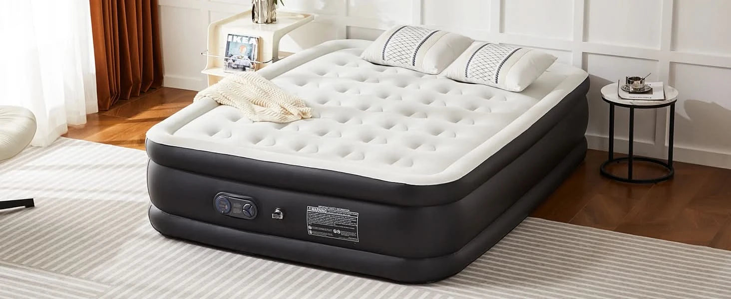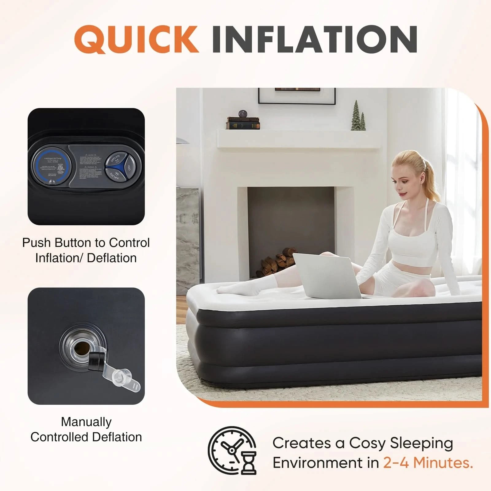 BUILT-IN HIGH CAPACITY PUMP: The air bed can be inflated/deflated in minutes at the push of a button, thanks to the built-in 110V high power electric air pump. Inflating time for different sizes of blowup air mattress: 22in queen size - 240s; 18in queen size - 200s; 16in queen size - 150s; 18in twin size - 130s; 16in twin size - 110s.