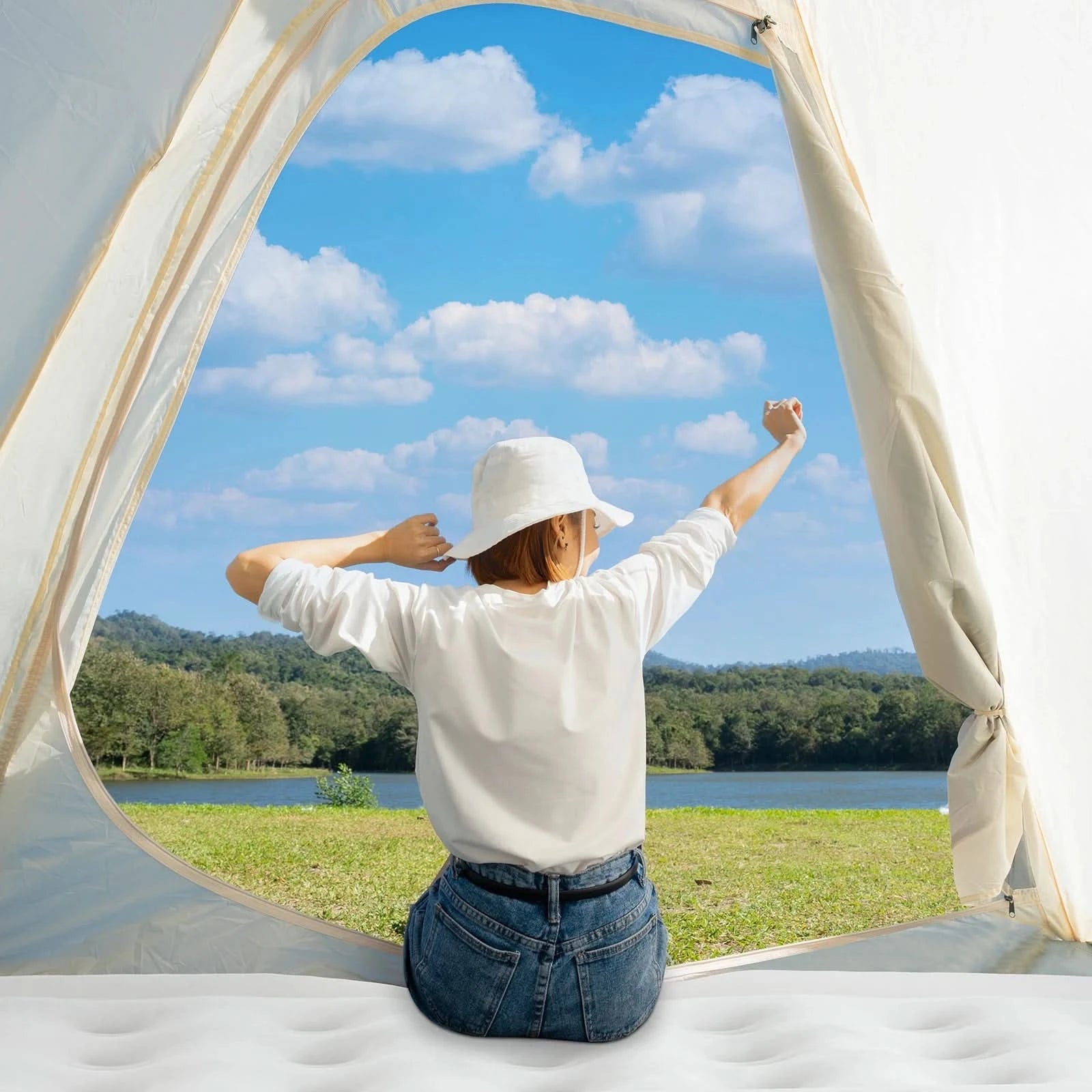 COMFORTABLE & SKIN-FRIENDLY FLOCKING TOP: To enhance your sleeping experience and comfort, the top of our camping air mattress is made of high quality flocking fabric, which is soft and comfortable, and also has the function of moisture wicking, so that you can always stay dry. In addition, the non-slip bottom design is very stable and reduces noise, so you can enjoy a good night's sleep.
