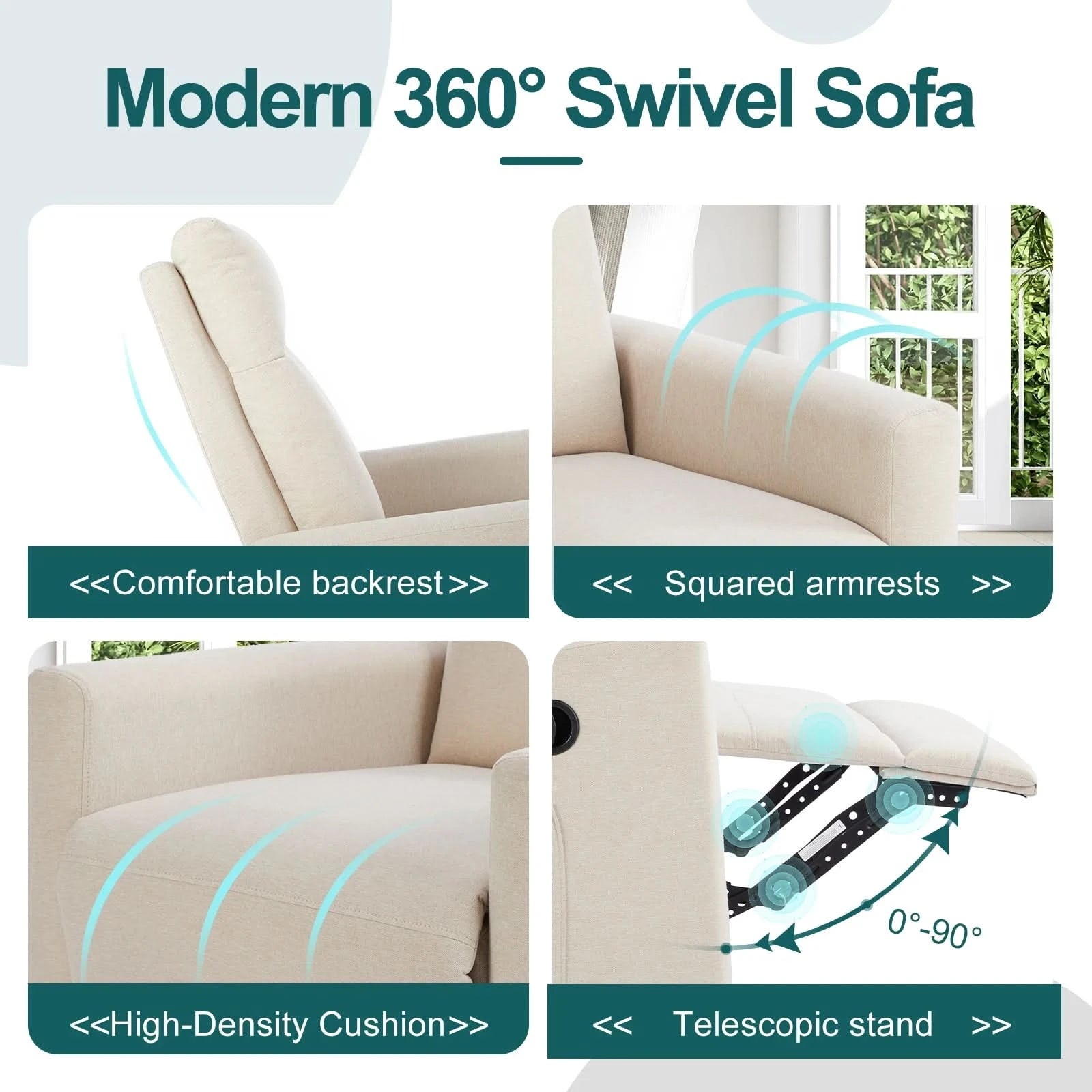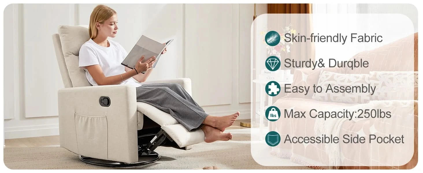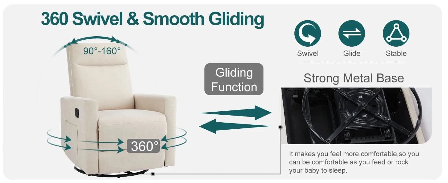 [360 Β° revolving recliner] The revolving rocking chair nursery allows you to rotate 360 Β°. The backrest can be tilted from 95 degrees to 160 degrees, and the pedal can be adjusted from 0 to 90 degrees to meet the needs of different scenes. You can fully relax on this magical baby glider chair.