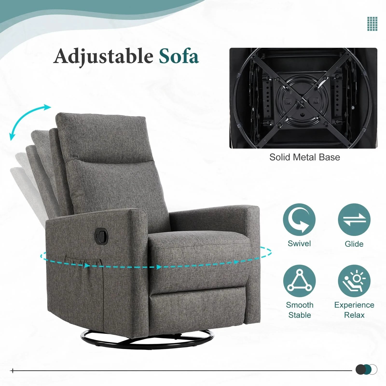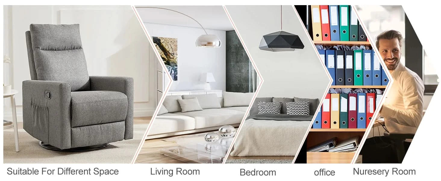 【Strong and Durable Metal Frame】You don't have to worry about nursery glider recliner durability! Our rocking recliner chairs are made of a sturdy metal frame, And the sturdy metal base provides a silky smooth swivel and stability, which can easily hold up to 250 lbs.