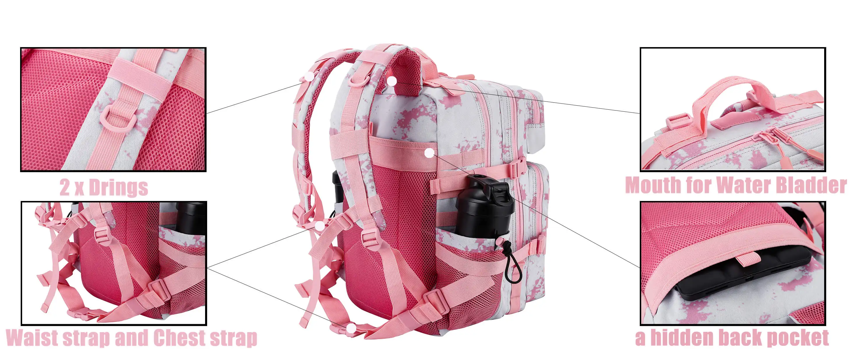 3. Tactical backpack has molle system, Plenty of mount points on the outside of tactical backpack for add-on pouches, designed to be used in combination with other equipment, you can load pockets, water bottle bag, accessory kits and other.