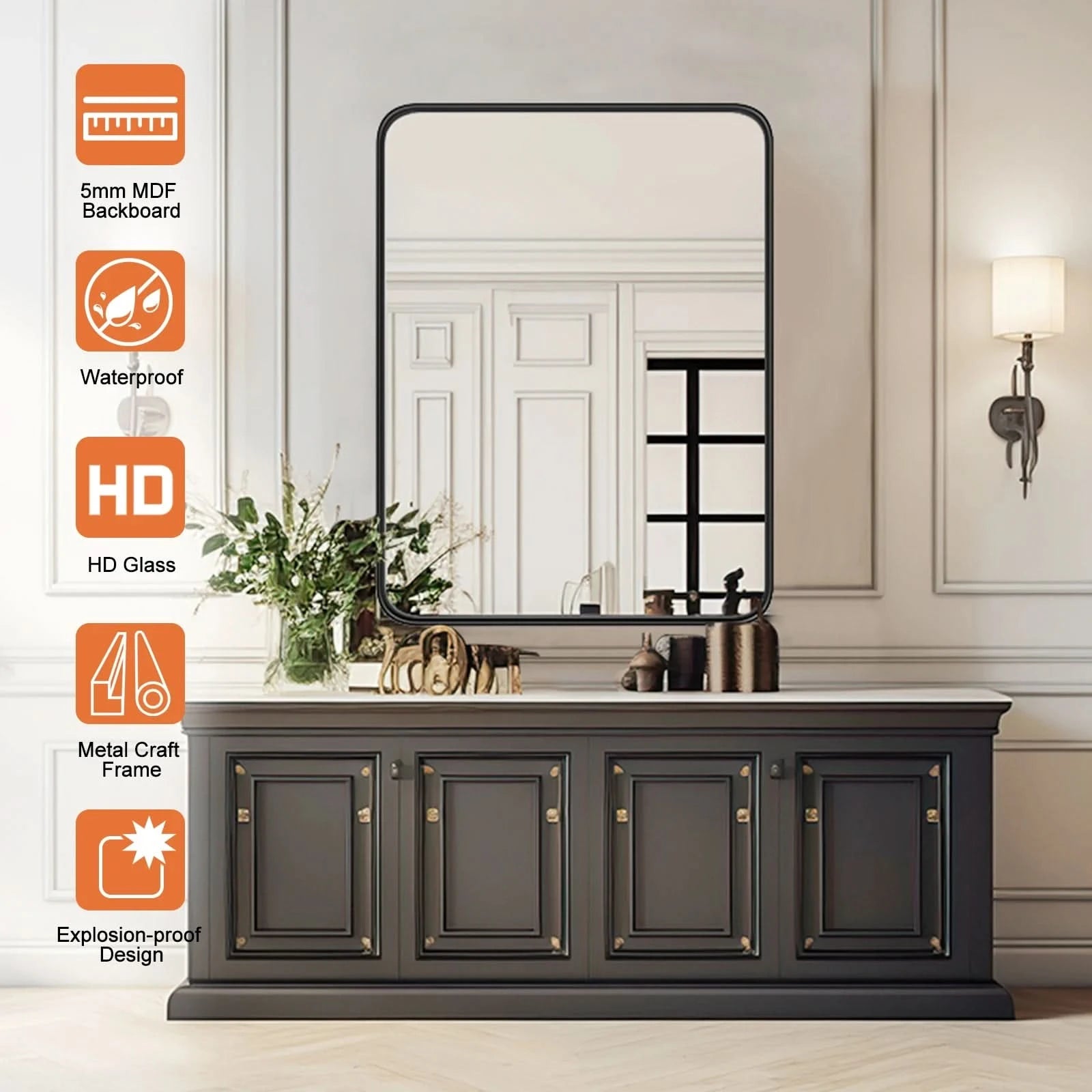 Matte Metal Framed Bathroom Mirror for Wall,Vanity Rectangle Rounded Corner Tempered Glass Mirror,Clear Reflection,Modern