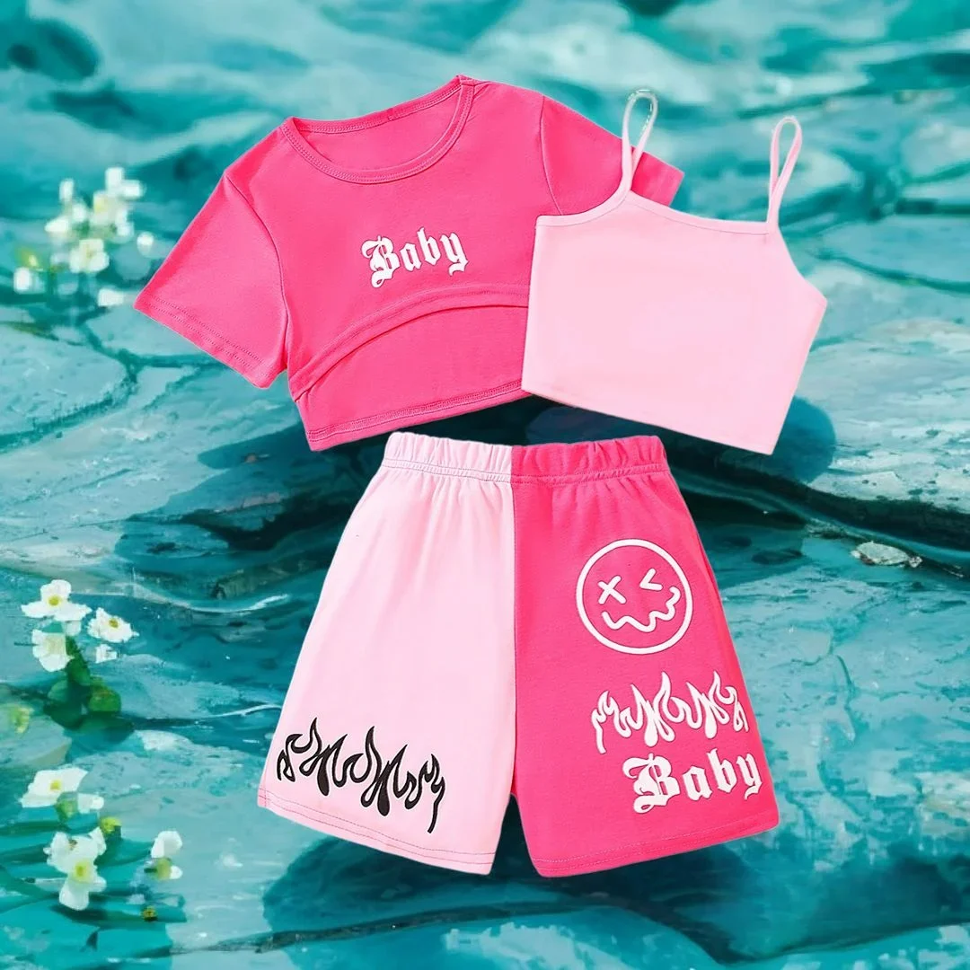 New Kids Girls Clothing Set Summer Short Sleeve Fashion Three Piece Girls Suit Color Block Children Outfits Girls Clothes 8-12Y