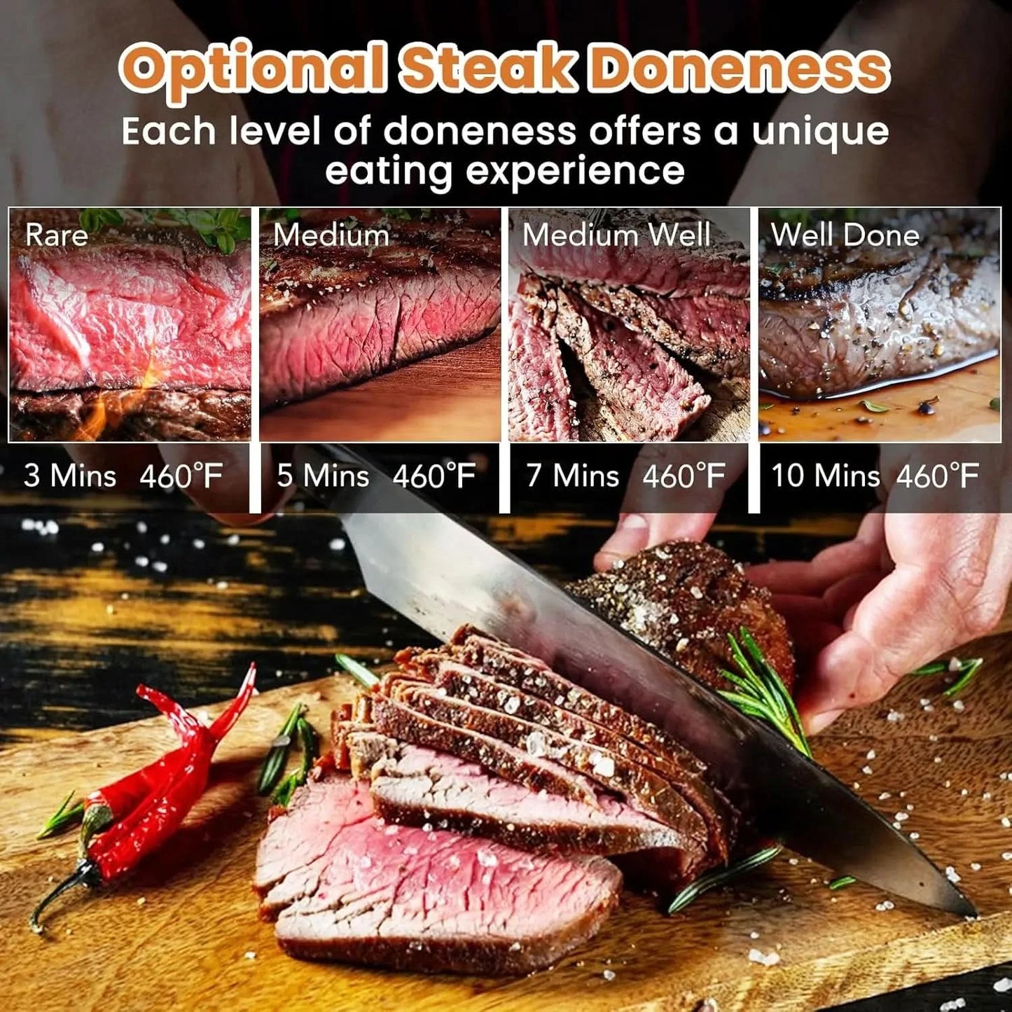 2. [7 Versatile Grilling Modes]: This indoor grill offers seven specialized grilling modes, giving you the flexibility to explore a wide range of culinary creations. Gently defrost, grill vegetables, toast sandwiches, and cook fish, sausages, chicken, and steak to perfection. Each doneness level—rare, medium, medium-well, and well-done—delivers a tailored dining experience.
