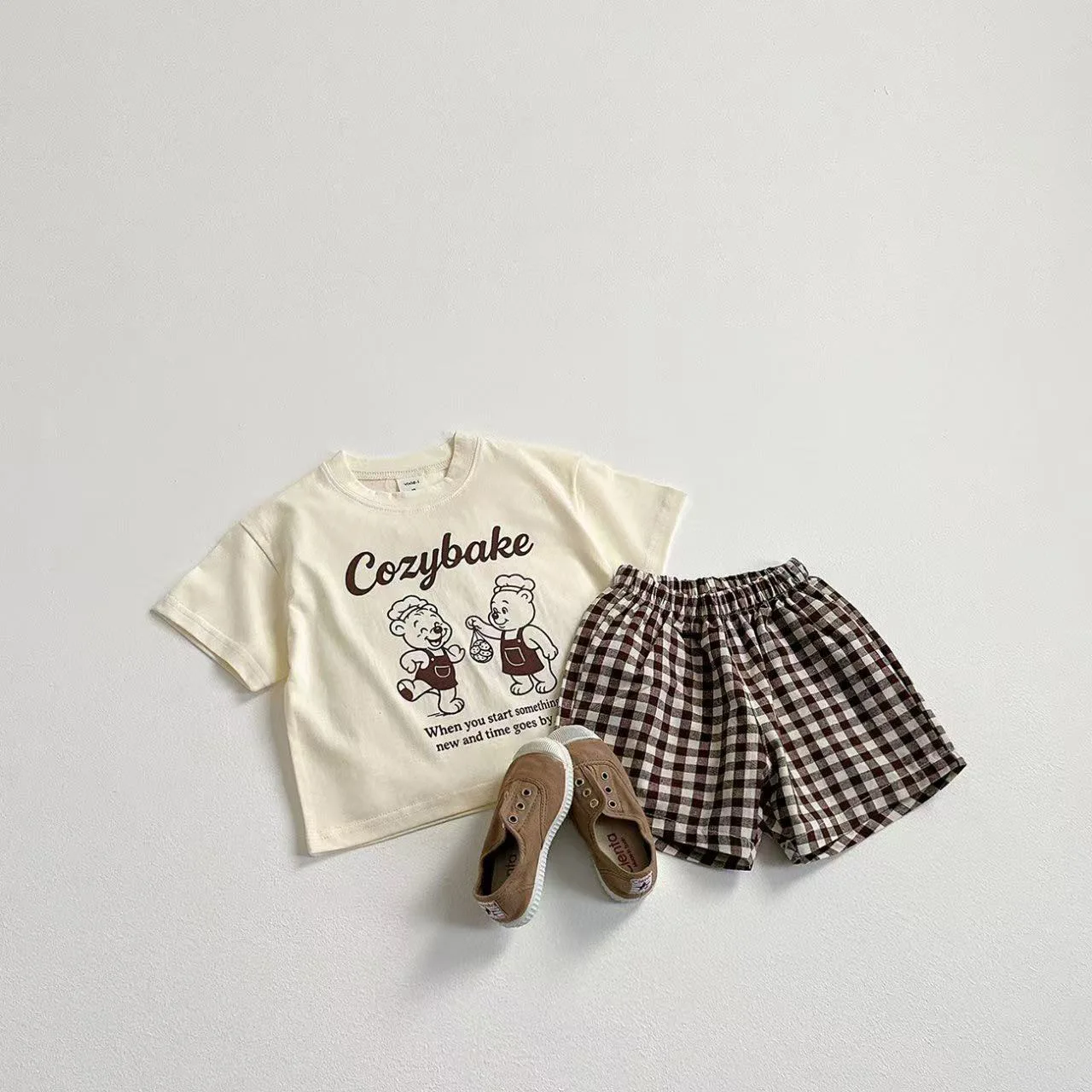 Print Tshirt Plaid Shorts 2Piece Set Summer Costume Boys Girls Baby Loose White Tees All-match Shorts New Child Trendy Outfits