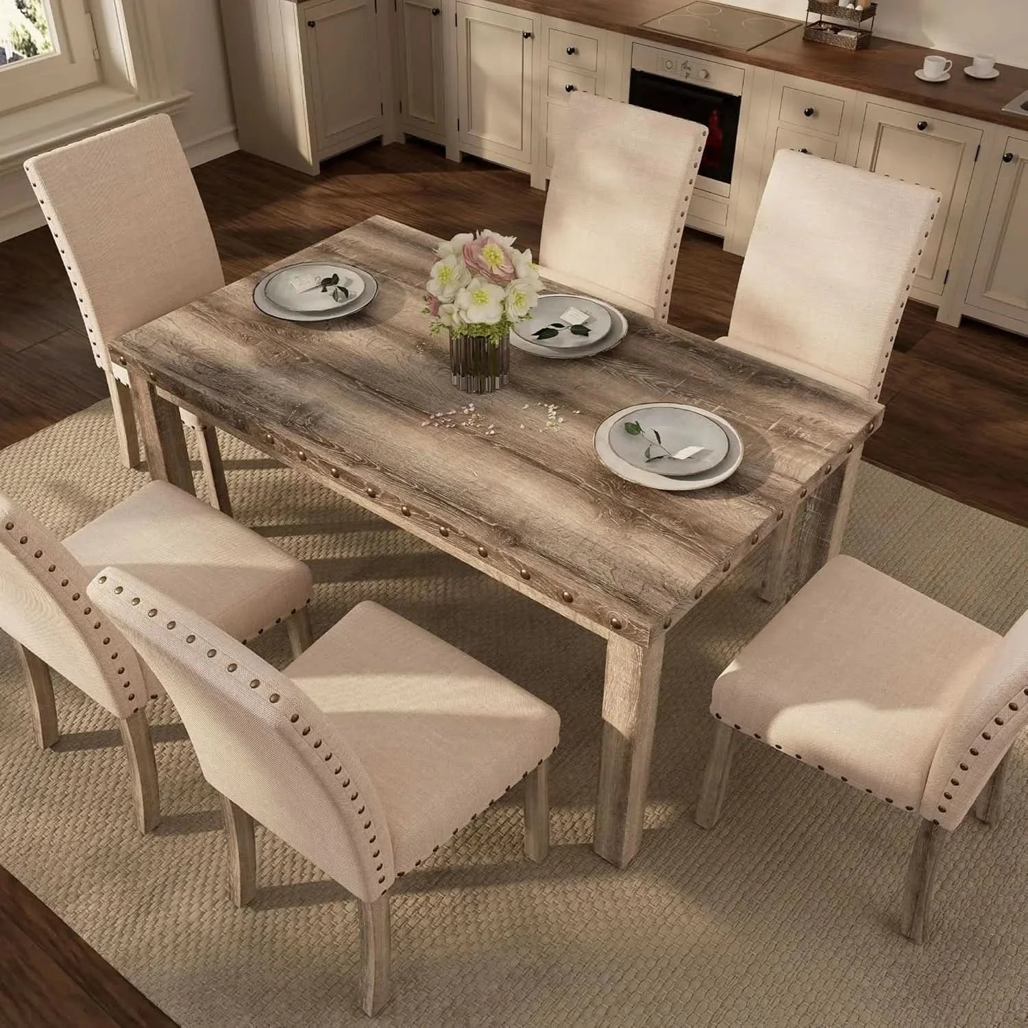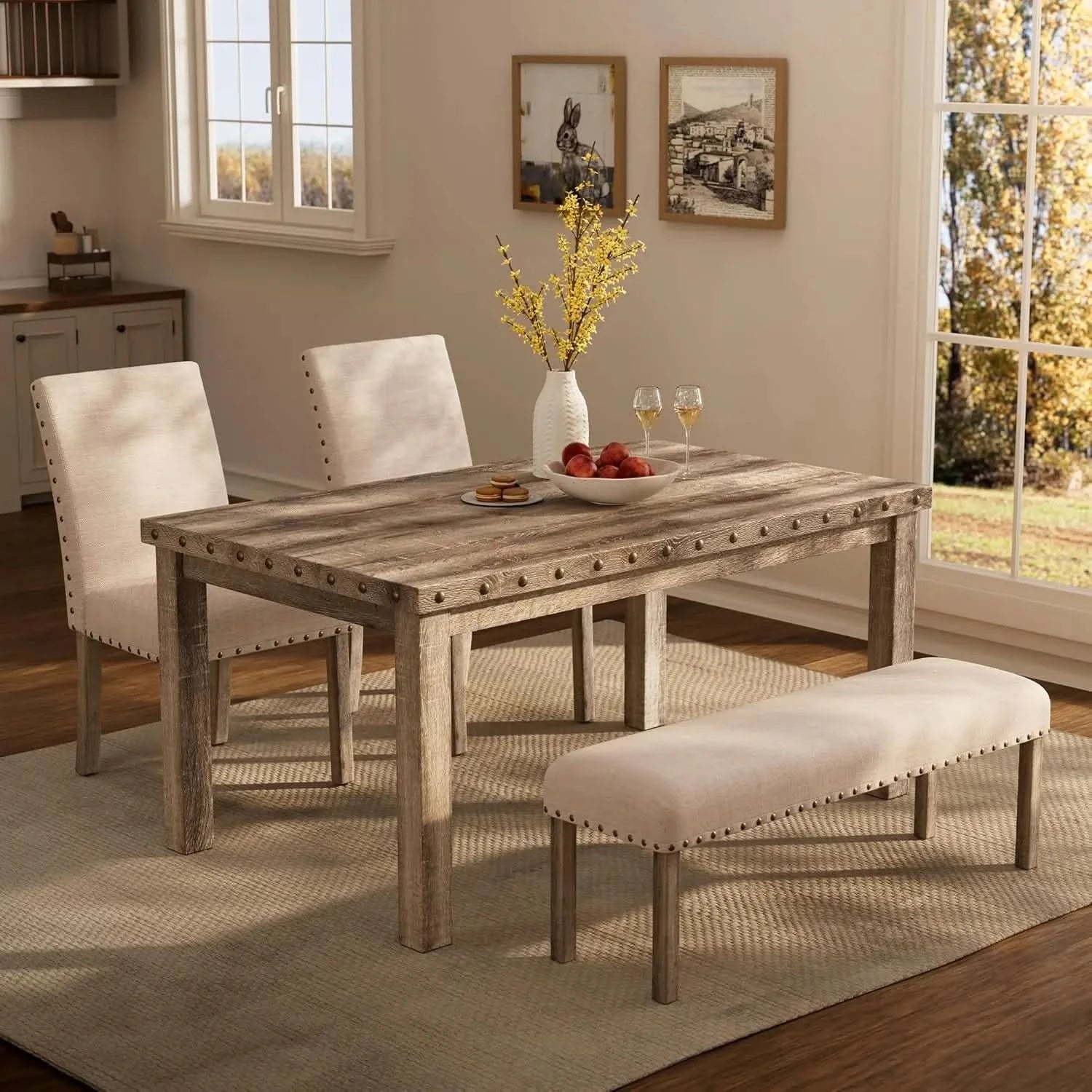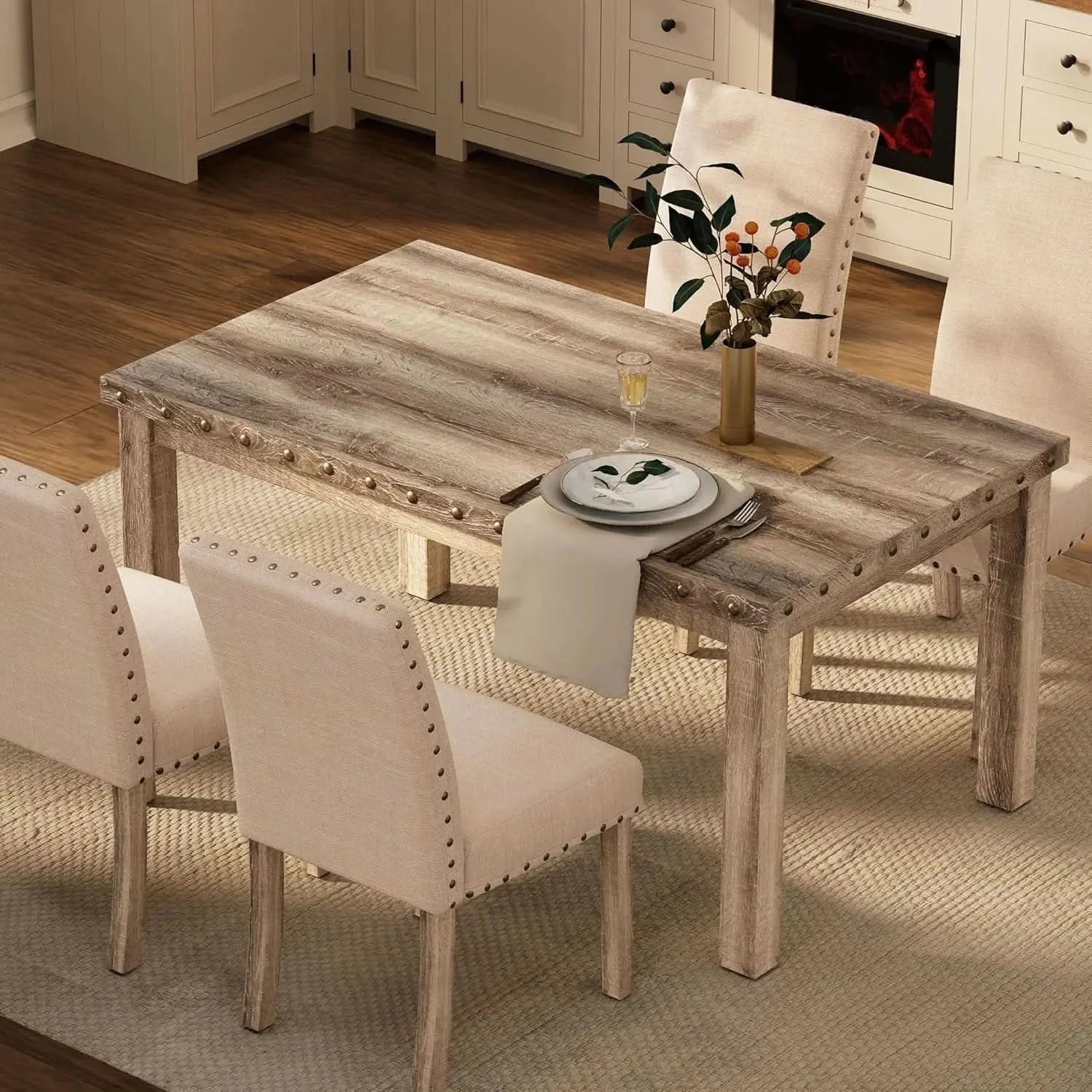 Rustic Dining Table, Farmhouse Kitchen Dining Chairs , Charming 60" Rectangular Wooden Table& Upholstered