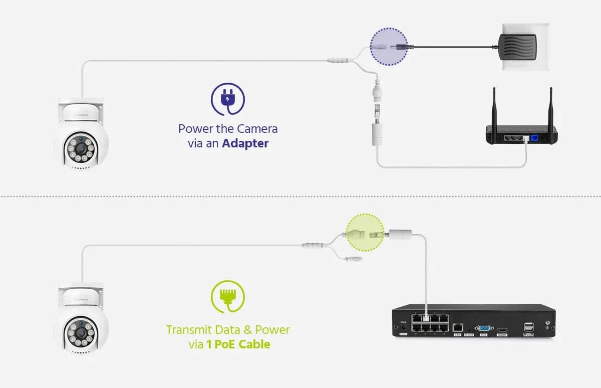 【Colorize the Night to See Clearer】 Featuring 8 premium LEDs, this security camera offers you to switch between a 33ft full-color night vision and a 72ft infrared night vision. IP66 weatherproof enables it boasts against harsh weather. Power it by PoE or DC 12V both work.