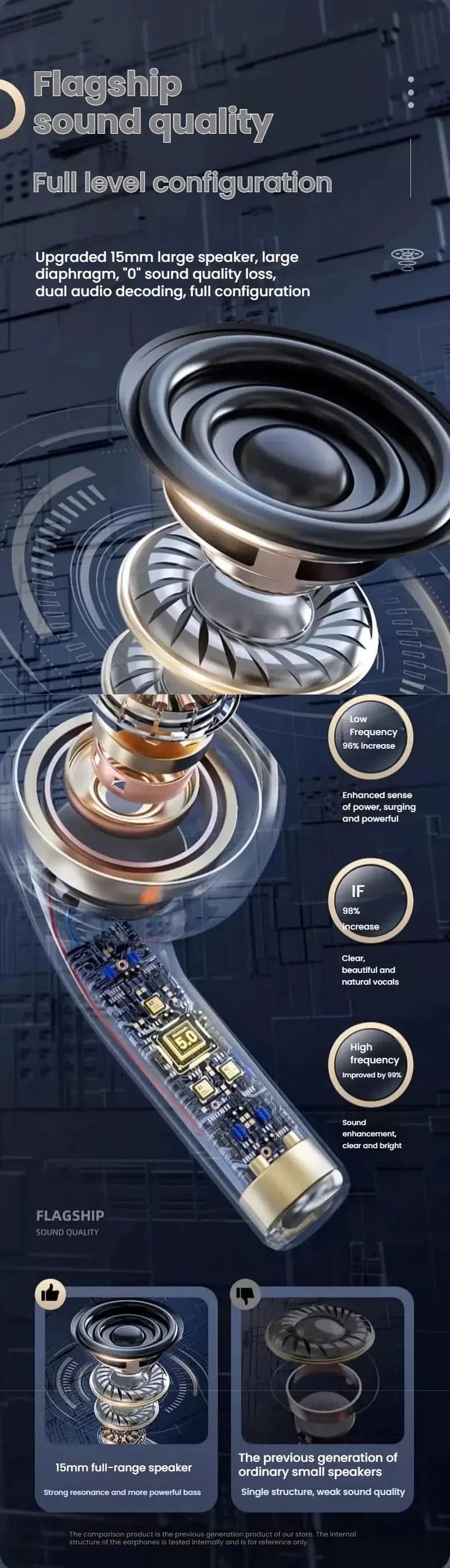 Flagship sound quality, full level configuration Upgrade 15mm large speaker, large diaphragm, sound quality "0" loss, dual audio decoding, ultra high configuration