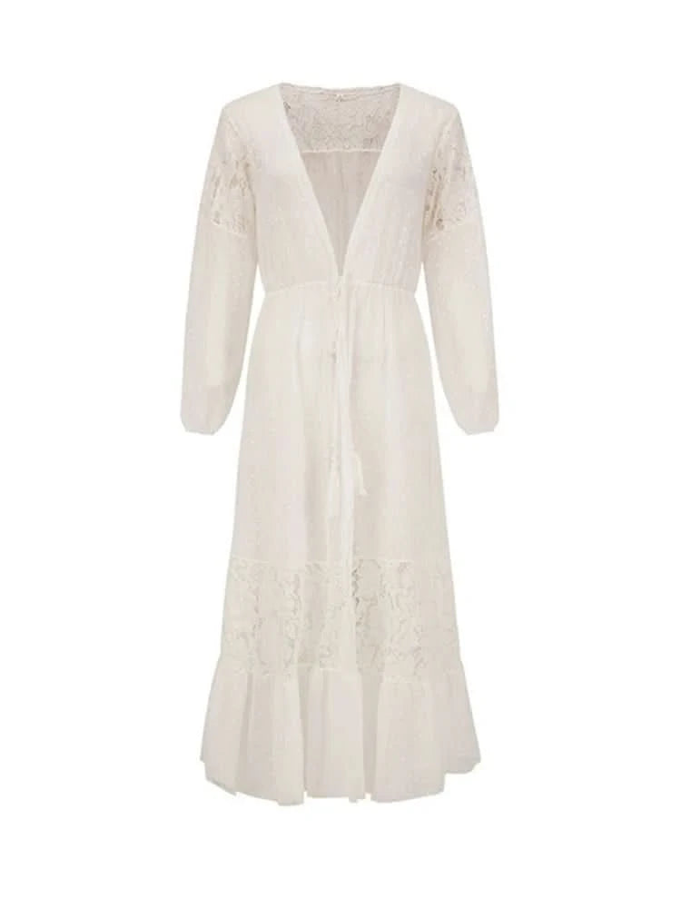 Summer Women Lace Patchwork Bikini Chiffon Beach Dress Cover Up Kimono Polka Dot Lace-up Cardigan Swimwear Long Sleeve Holiday
