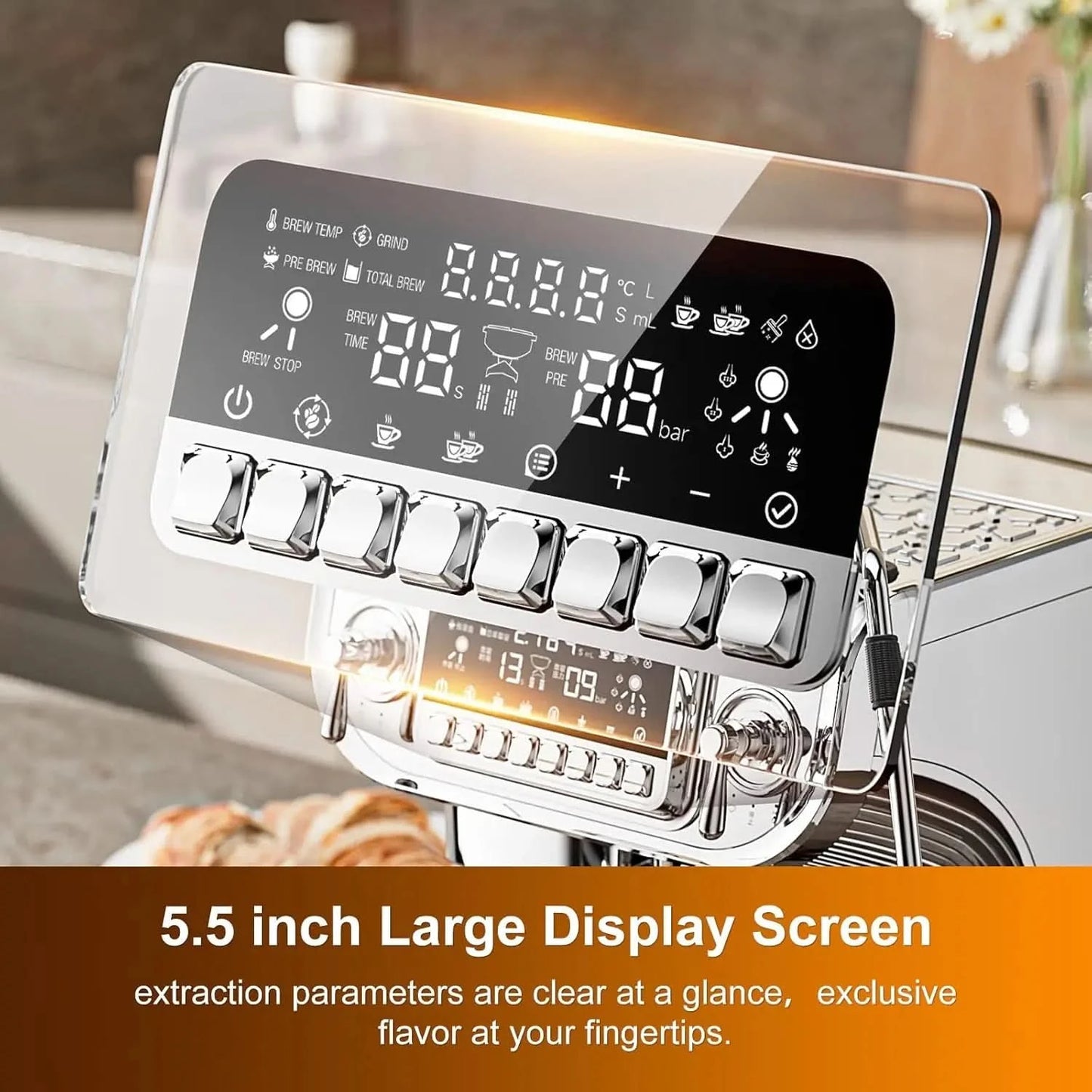 2. 【STRESS-FREE OPERATION】5.5 inch large display screen, extraction pressure, extraction time and other parameters are clear at a glance.Piano button design.exclusive flavor at your fingertips. Brew any of your favorite specialty coffee-shop drinks at home Easy and convenient, sweeping away the boredom of life
