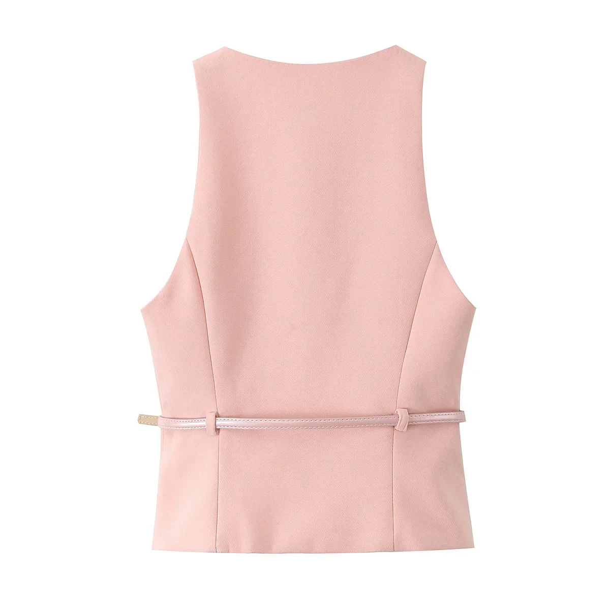 TRAFZA Vintage Chic Solid Women Suit V Neck Sleeveless Sashes Vest Blazer Straight Shorts New Fashion 2025 Summer Office Sets